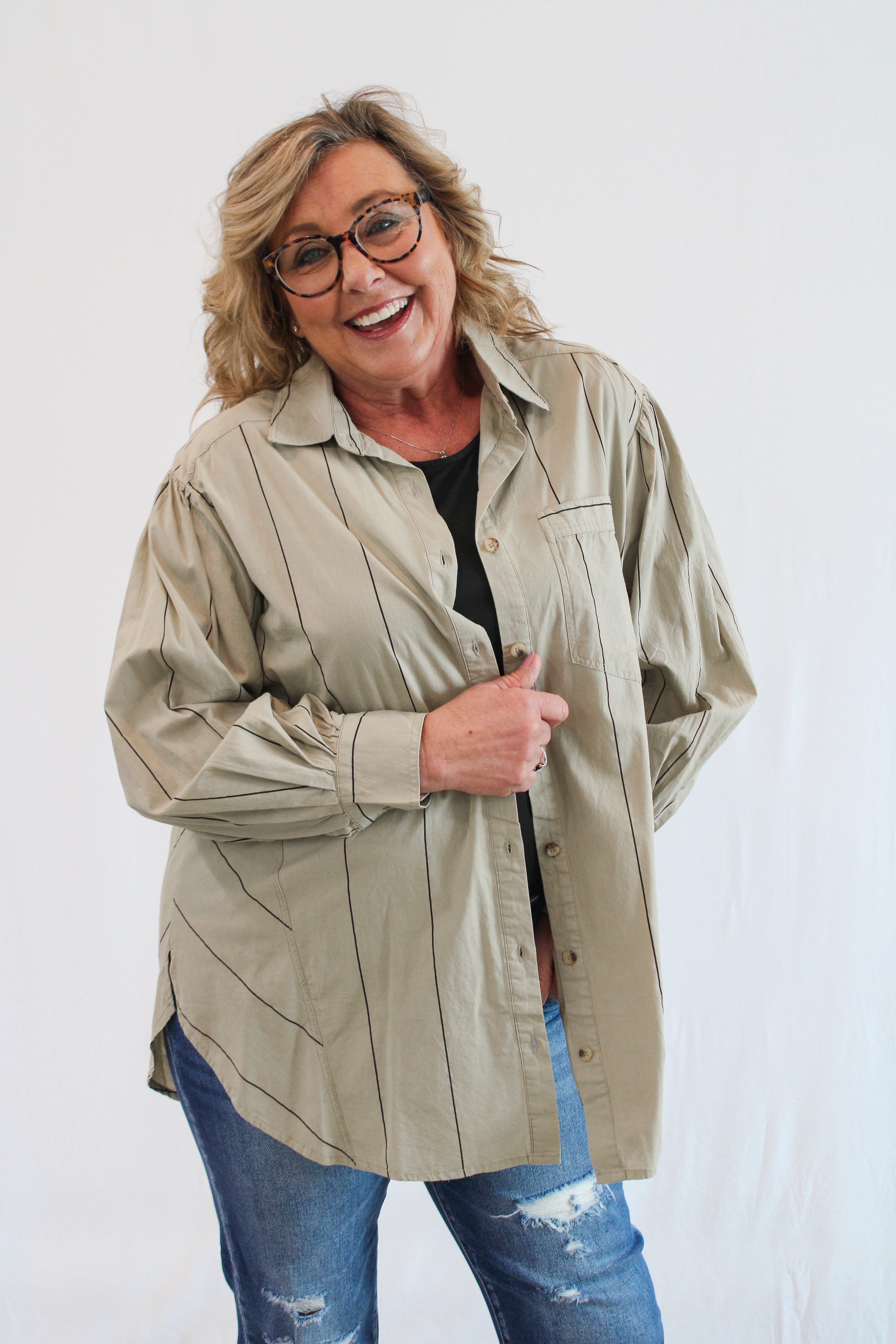 Get ready to slay the fashion game with the Jina Oversized Button Down! This soft wash striped top features a button down front, collared neckline, and buttoned cuffs for a chic look. With added seams for a slimming effect, this high-low design boasts two side slits and a chest pocket. Plus, its slightly oversized fit is perfect for a comfy, yet stylish outfit.