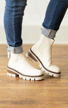 Cream boot with brown stitching around the sole, elastic at ankle for easy on and off!
