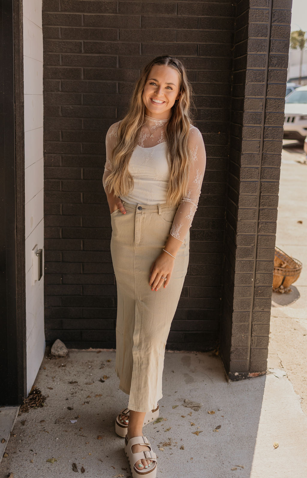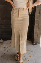 Get ready to rock the perfect blend of comfort and style with our garment washed pencil skirt. Made from stretchy twill fabric, our skirt features a metal button closure and functional front and back pockets. The open front slit adds some sass. Plus, our garment washing process makes it soft and lived in.