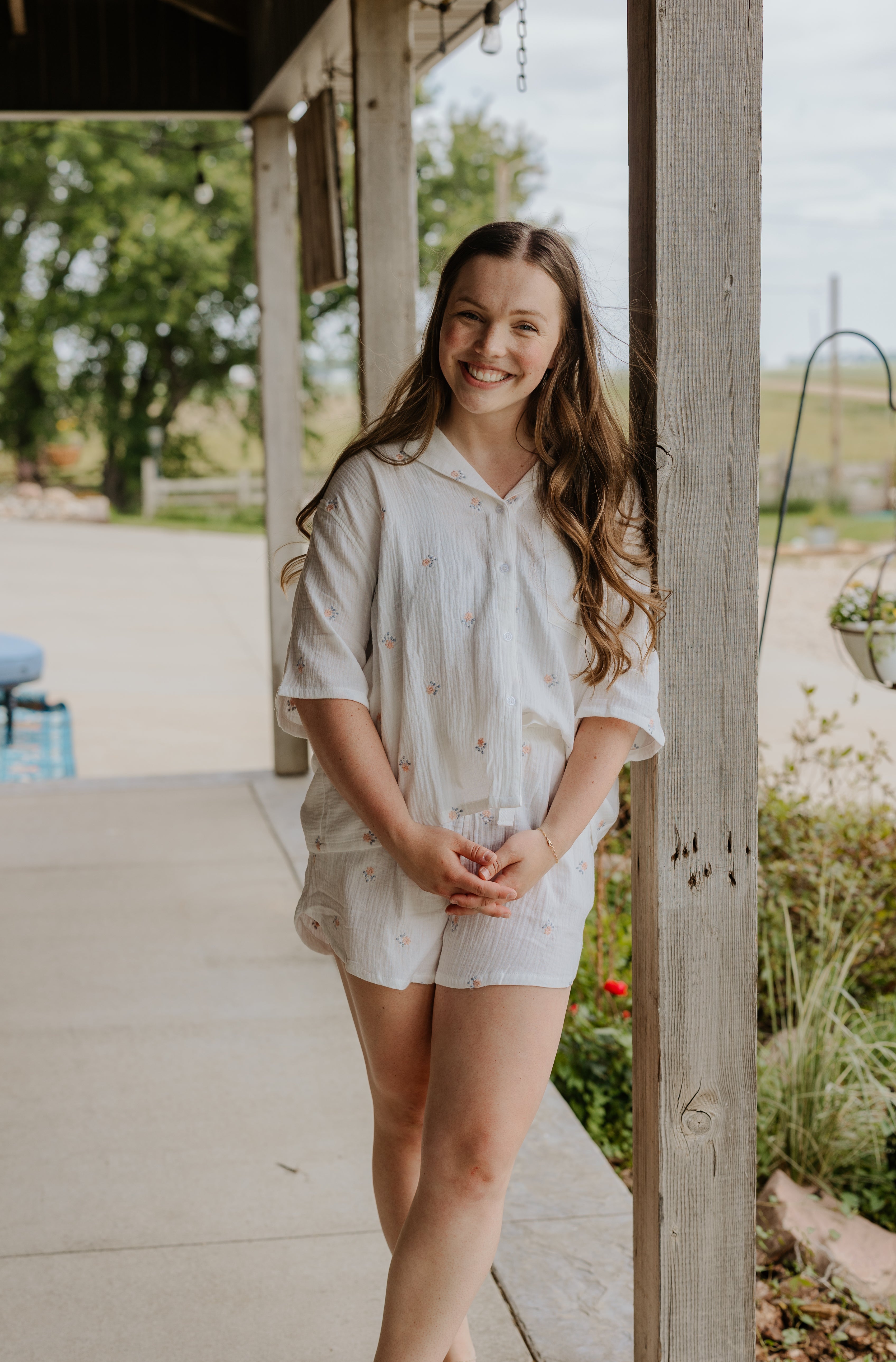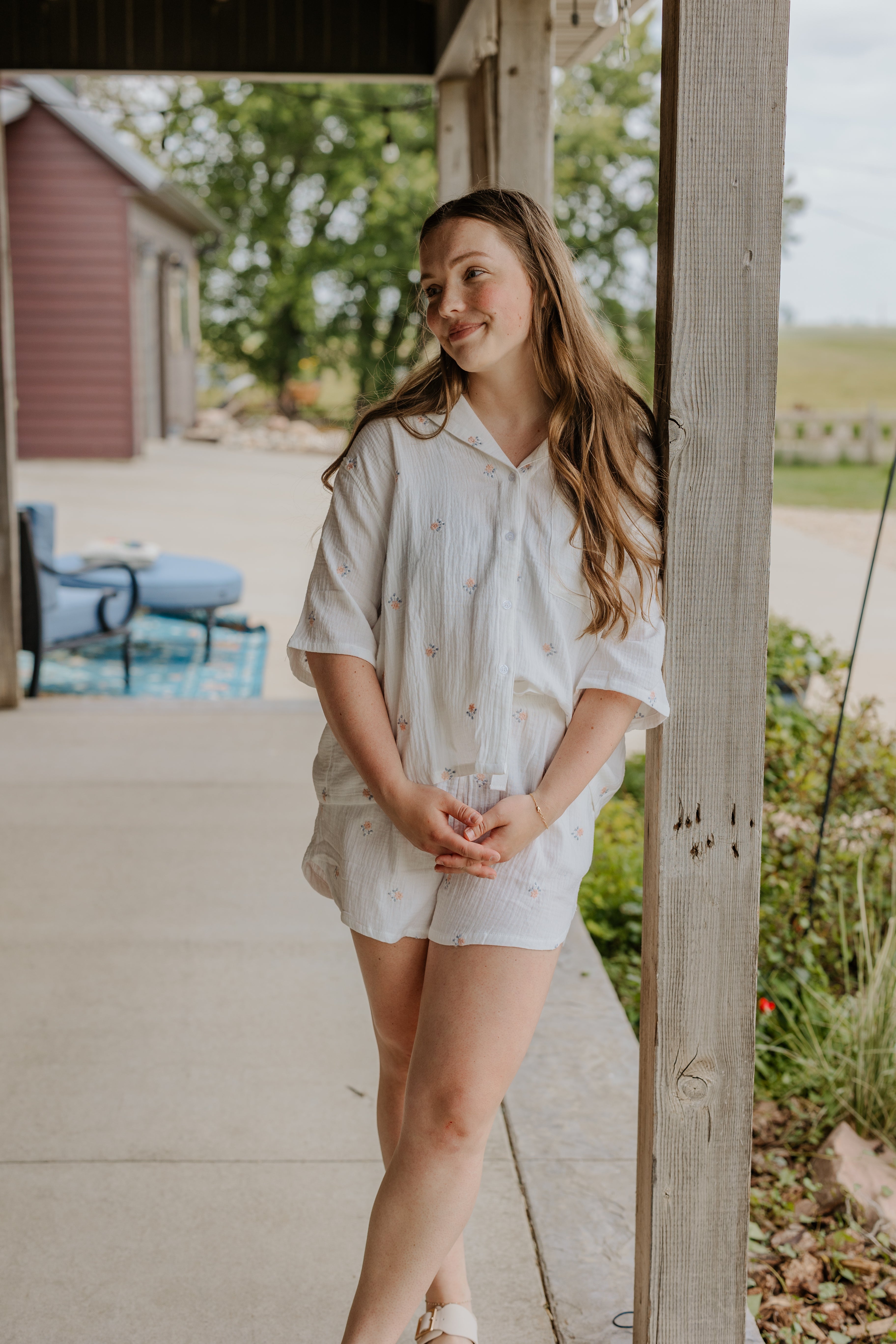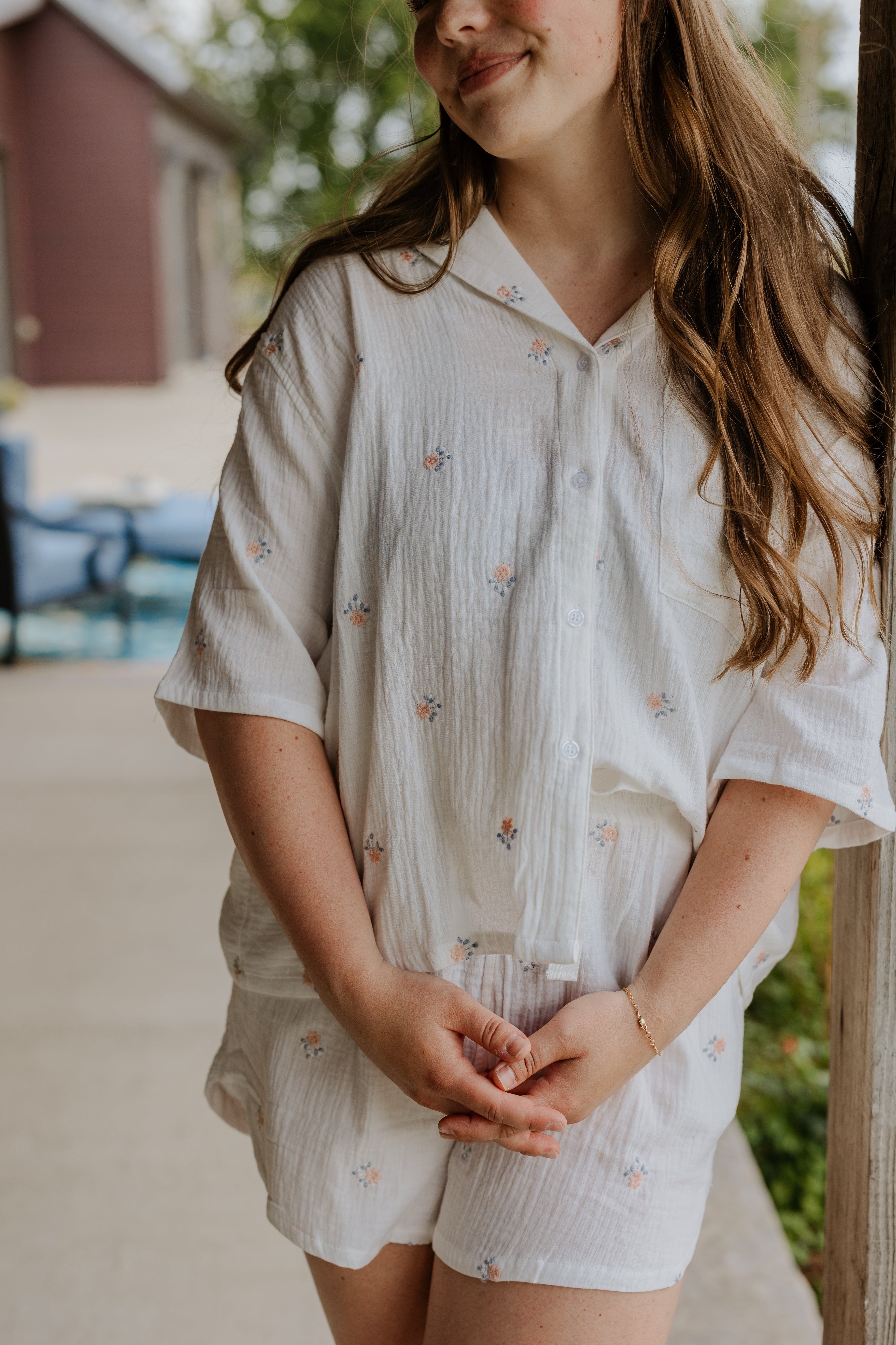 Embrace your sunny side in this delightful floral embroidered matching set! The collared shirt features playful blooms dancing across soft 100% cotton fabric, with a button-front placket and breezy short sleeves. Slip into this relaxed-fit ensemble and watch as good vibes follow you everywhere you go!