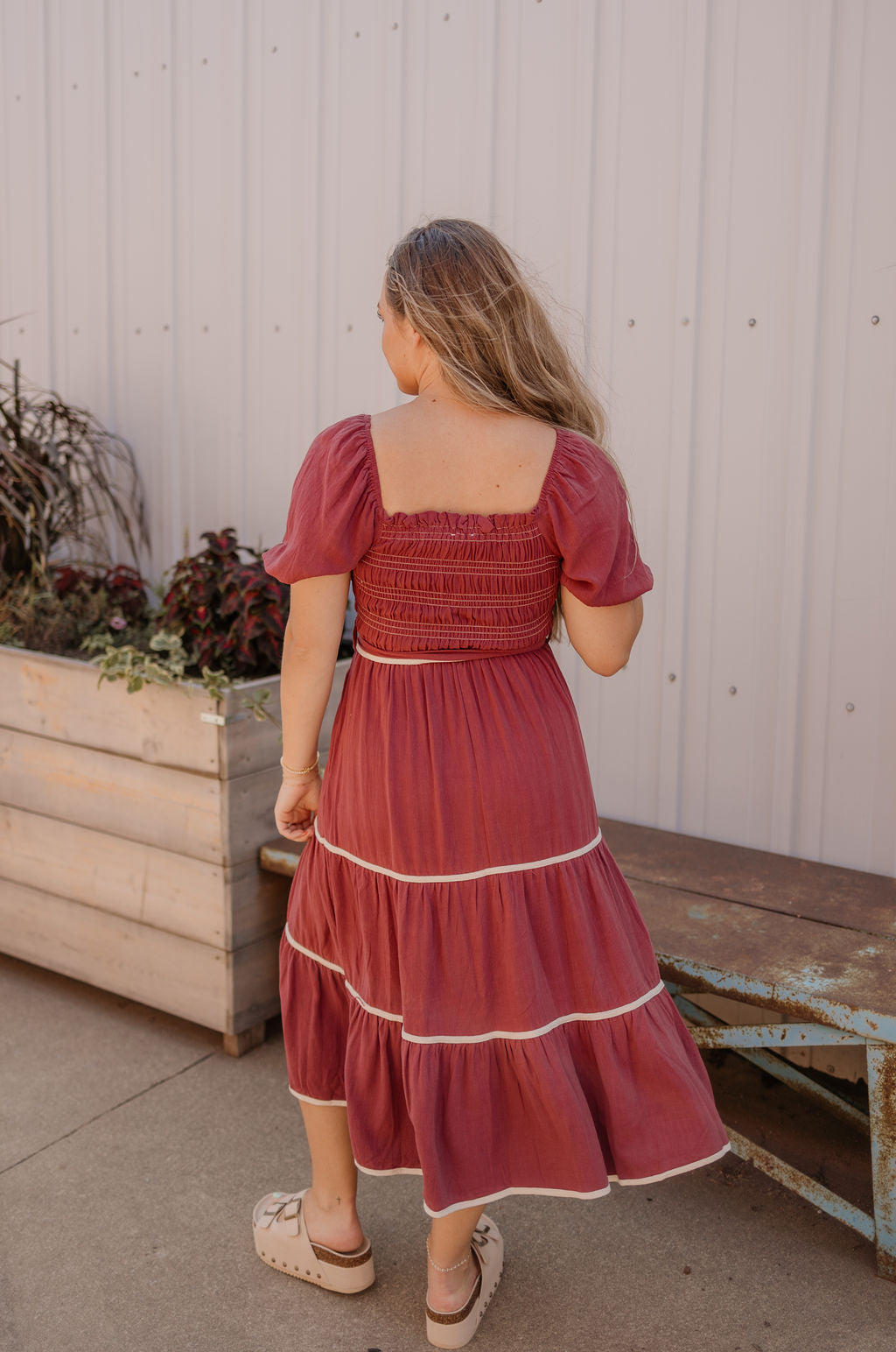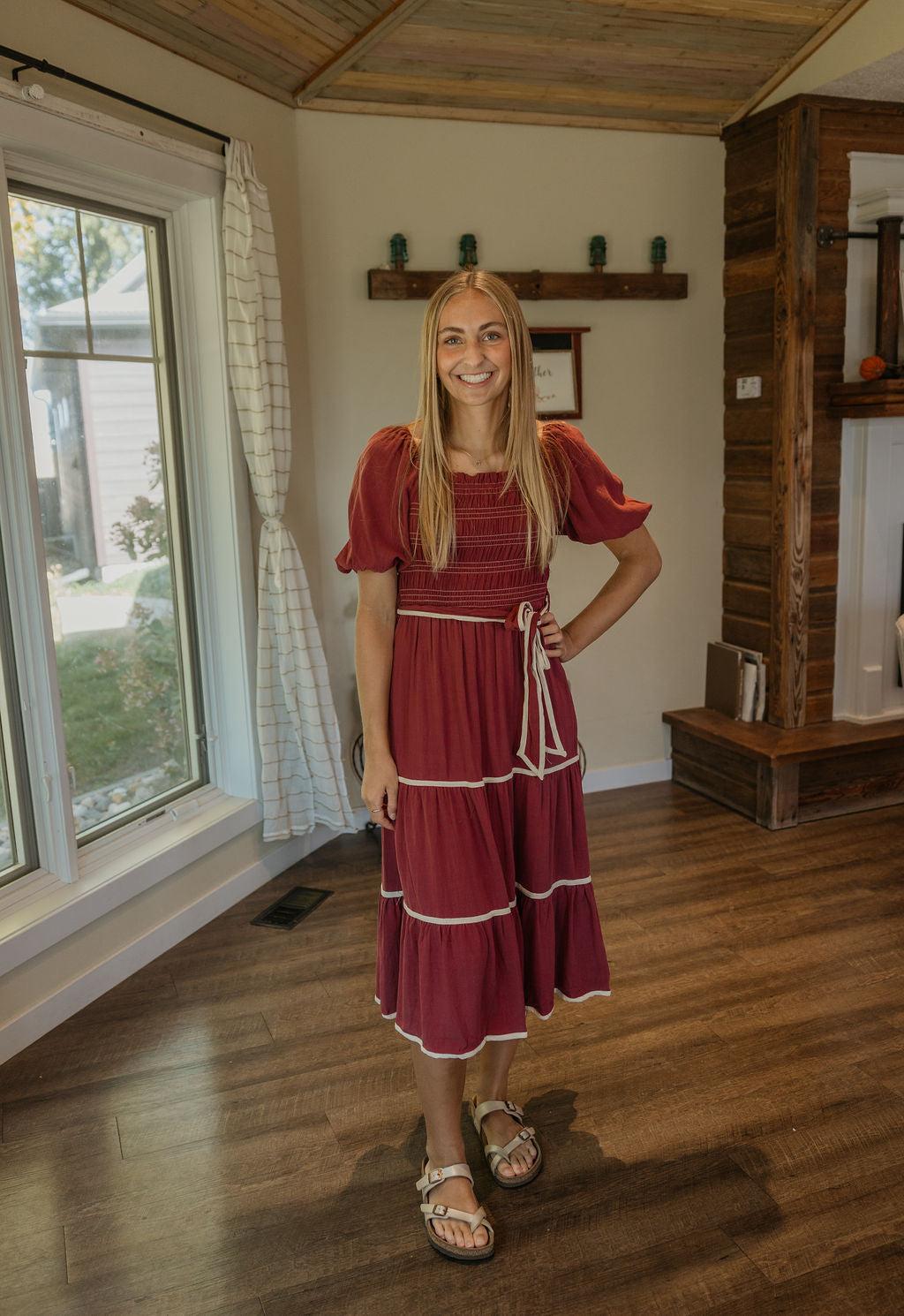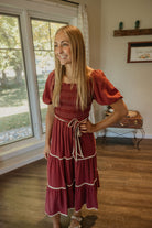 Be the envy of every fashionista with the CORINDA SMOCKED TOP DRESS BY IVY & CO. This berry-colored dress features playful bell sleeves, smocked top, and tiered woven midi design with contrasting binding details. Perfect for any occasion, this dress will make you stand out in a crowd! (Plus, it's super comfortable!)