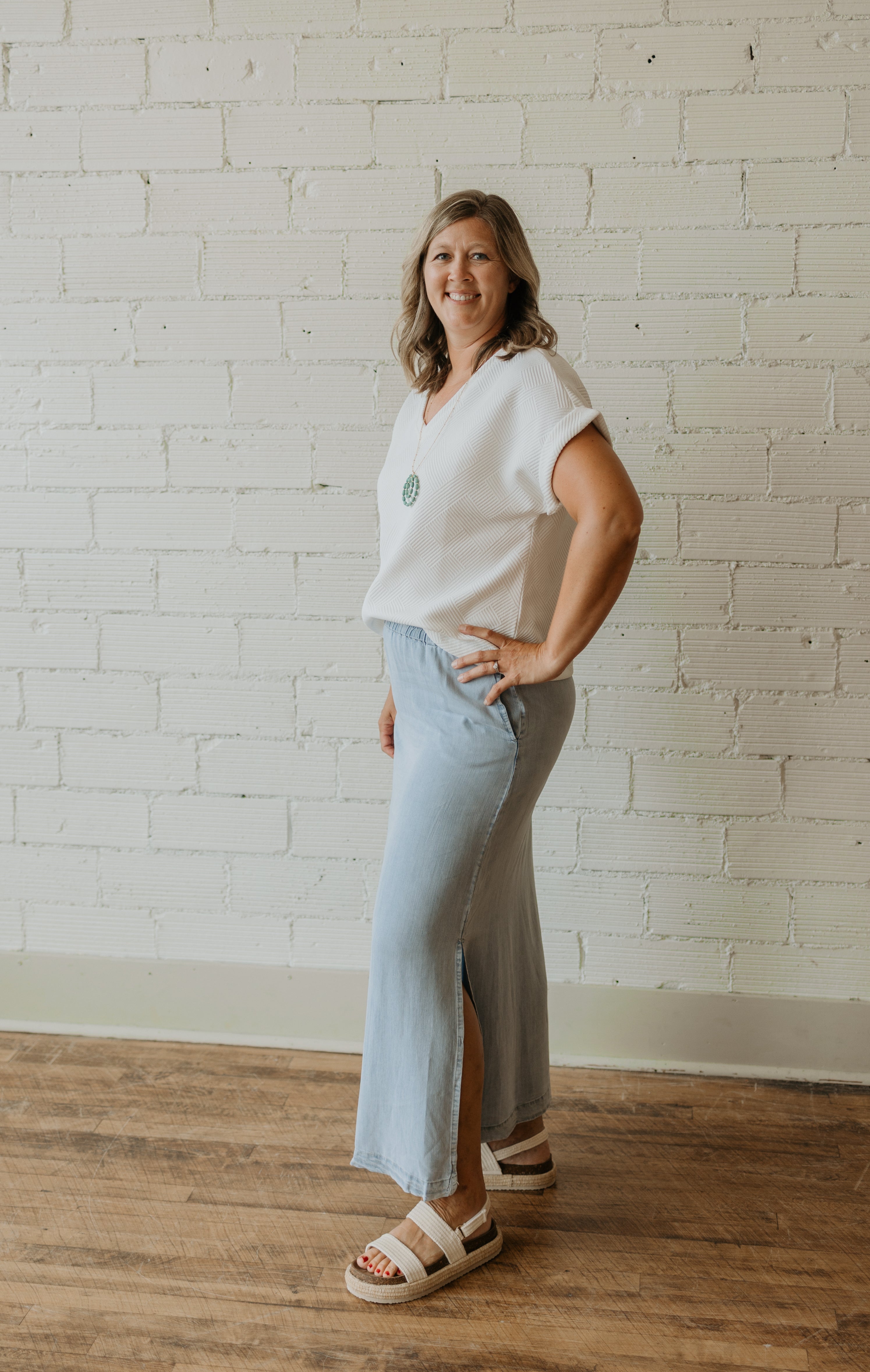 Forever cool and classic denim maxi in our softest tencel fabric, featuring an elastic waist, dual side pockets and side slits.