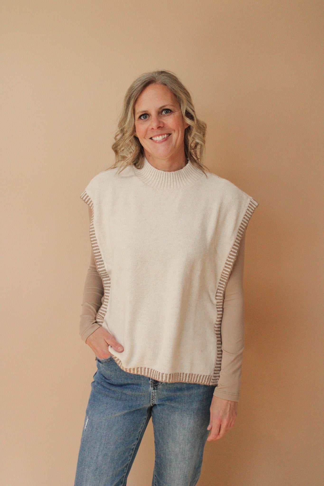 Elevate your layering game with this chic knit sweater vest! Featuring a flattering mock neck and eye-catching side tie detail, it's the perfect piece to add dimension to any outfit. The contrast detailing brings just the right amount of visual interest without overwhelming your look. Versatile enough to wear solo or layered over your favorite tee, this vest strikes the ideal balance between cozy and stylish. A playful essential that works as hard as you do.