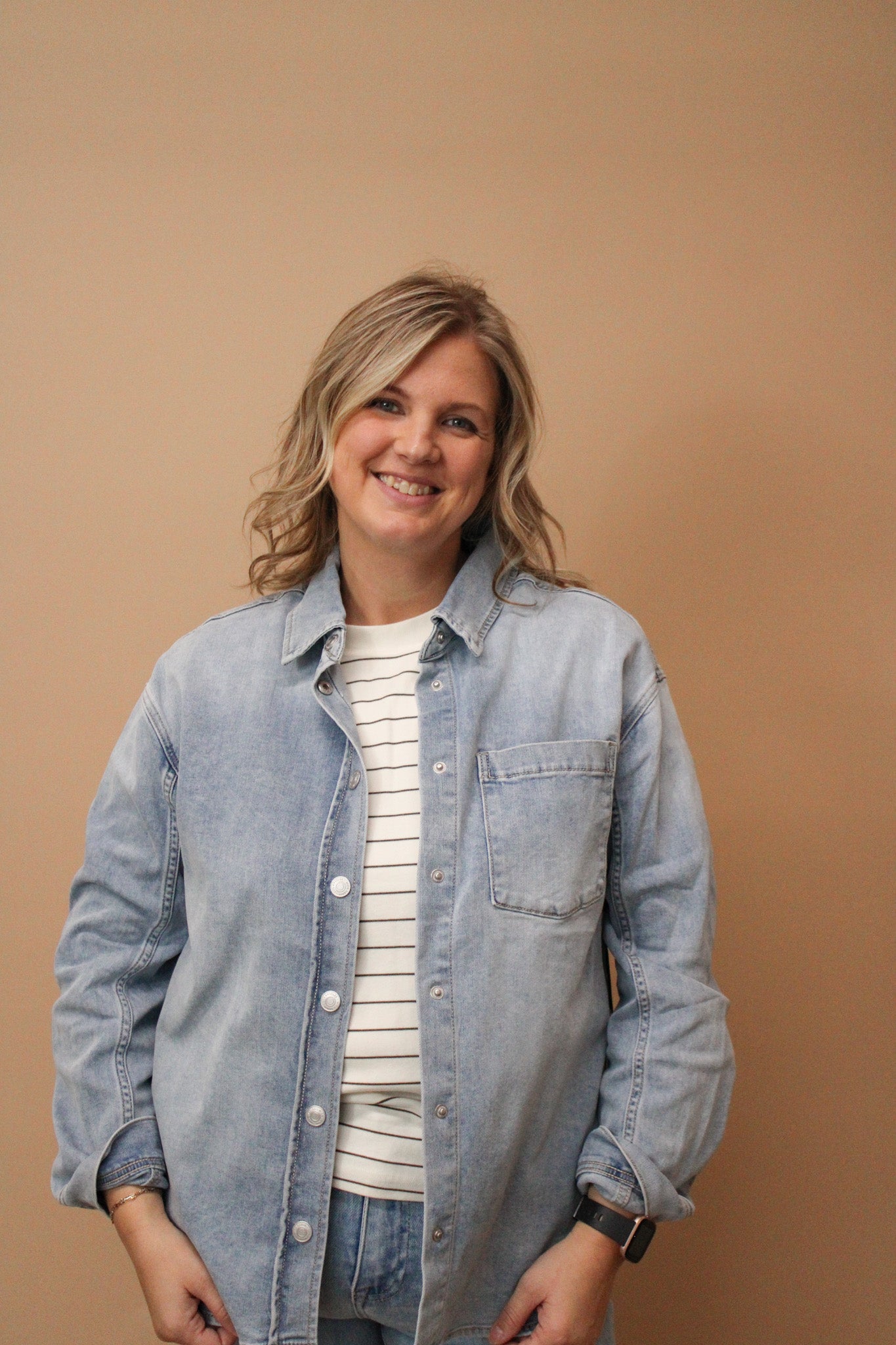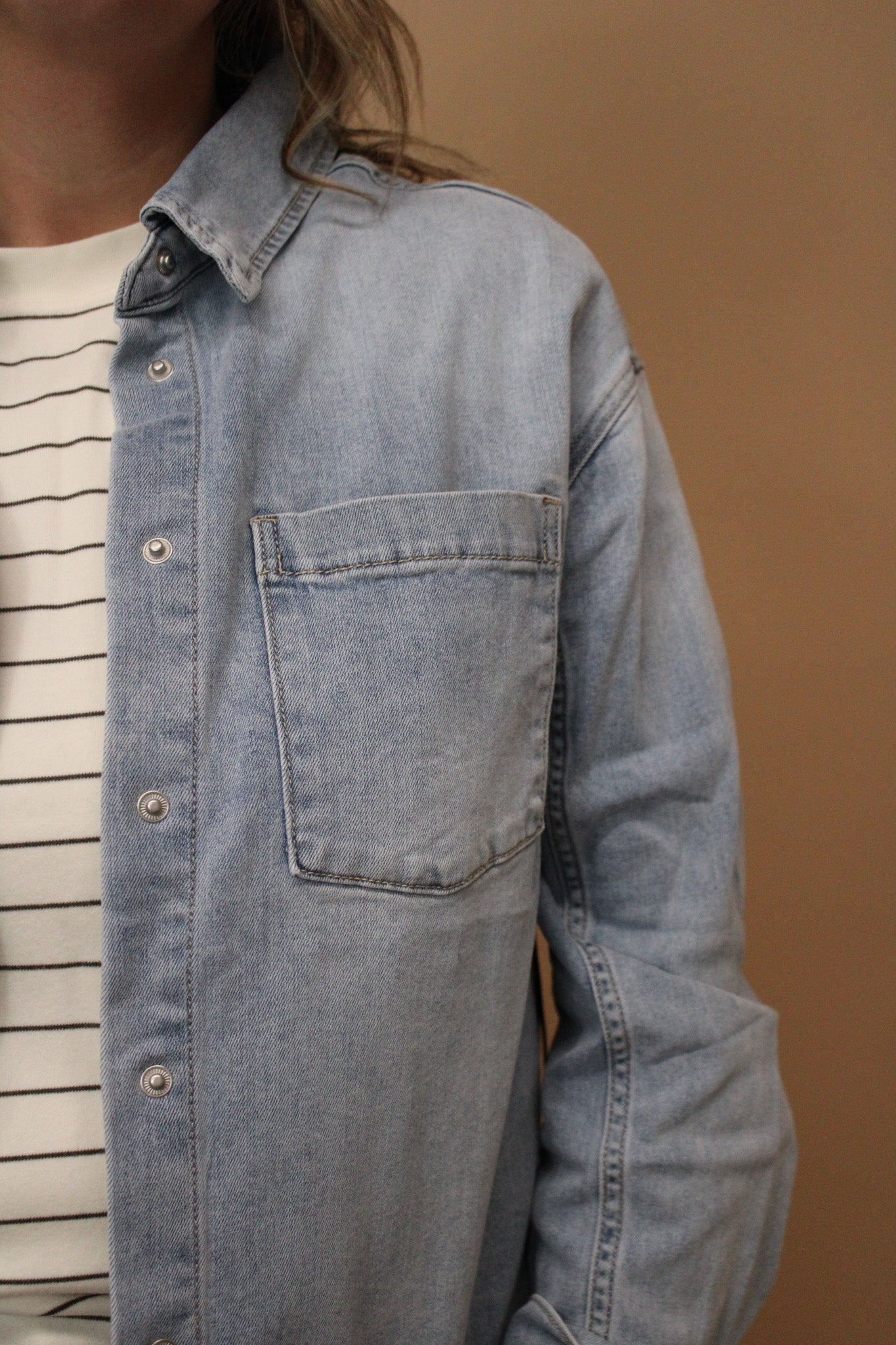 This washed denim shirt brings effortless cool to your wardrobe with its soft, worn-in feel and timeless style. Perfect for layering or rocking on its own, it adds a playful edge to any outfit. Expect both comfort and easy-chic vibes wherever you wear it! 93% cotton, 6% Polyester, 1% Spandex