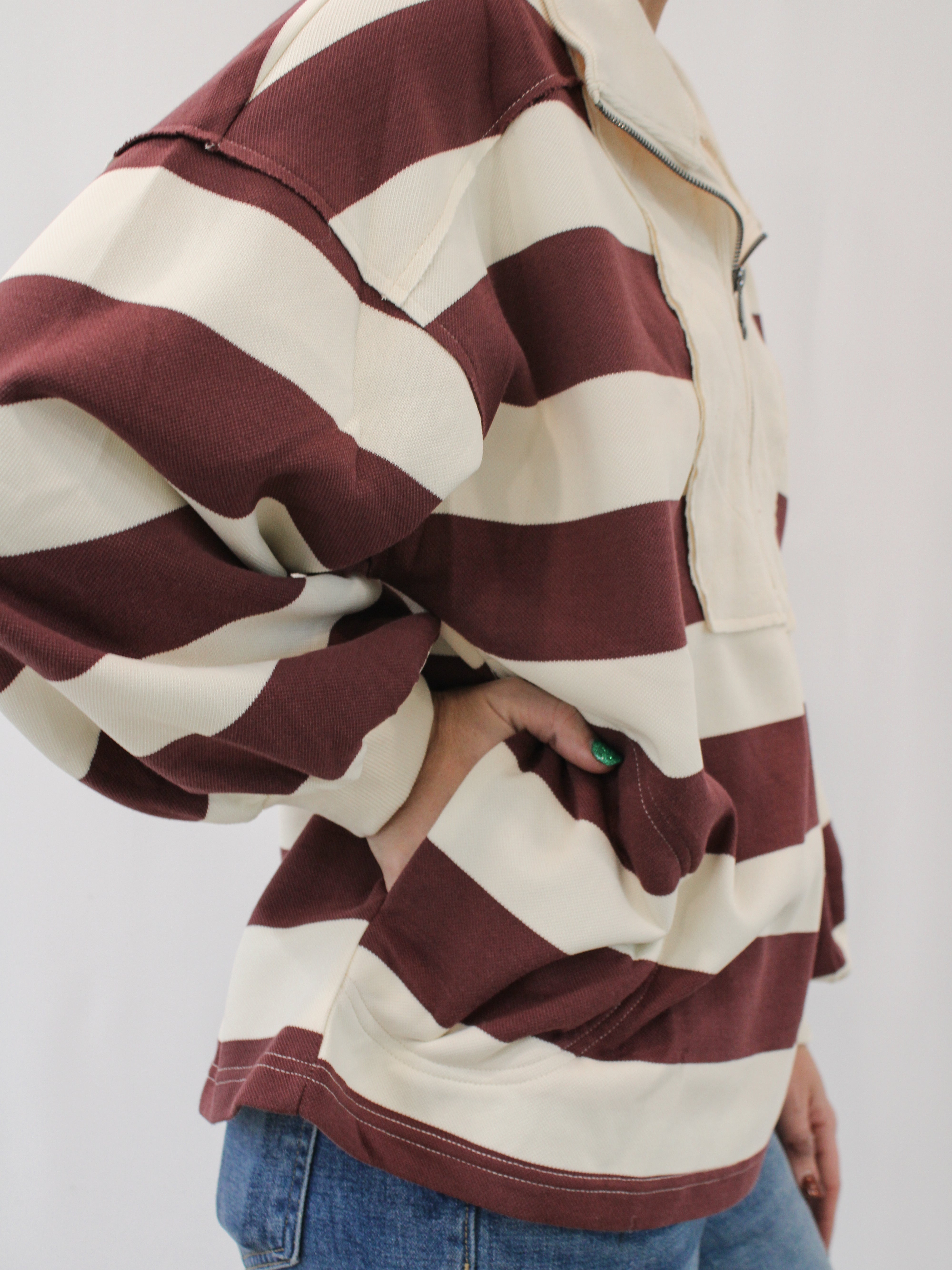 Add a touch of elegance to your wardrobe with our ARIETTA COLLARED HALF ZIP PULLOVER. This luxurious pullover features a wide striped collared design and quilted ribbed accents. Stay warm and stylish all season long.