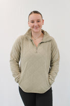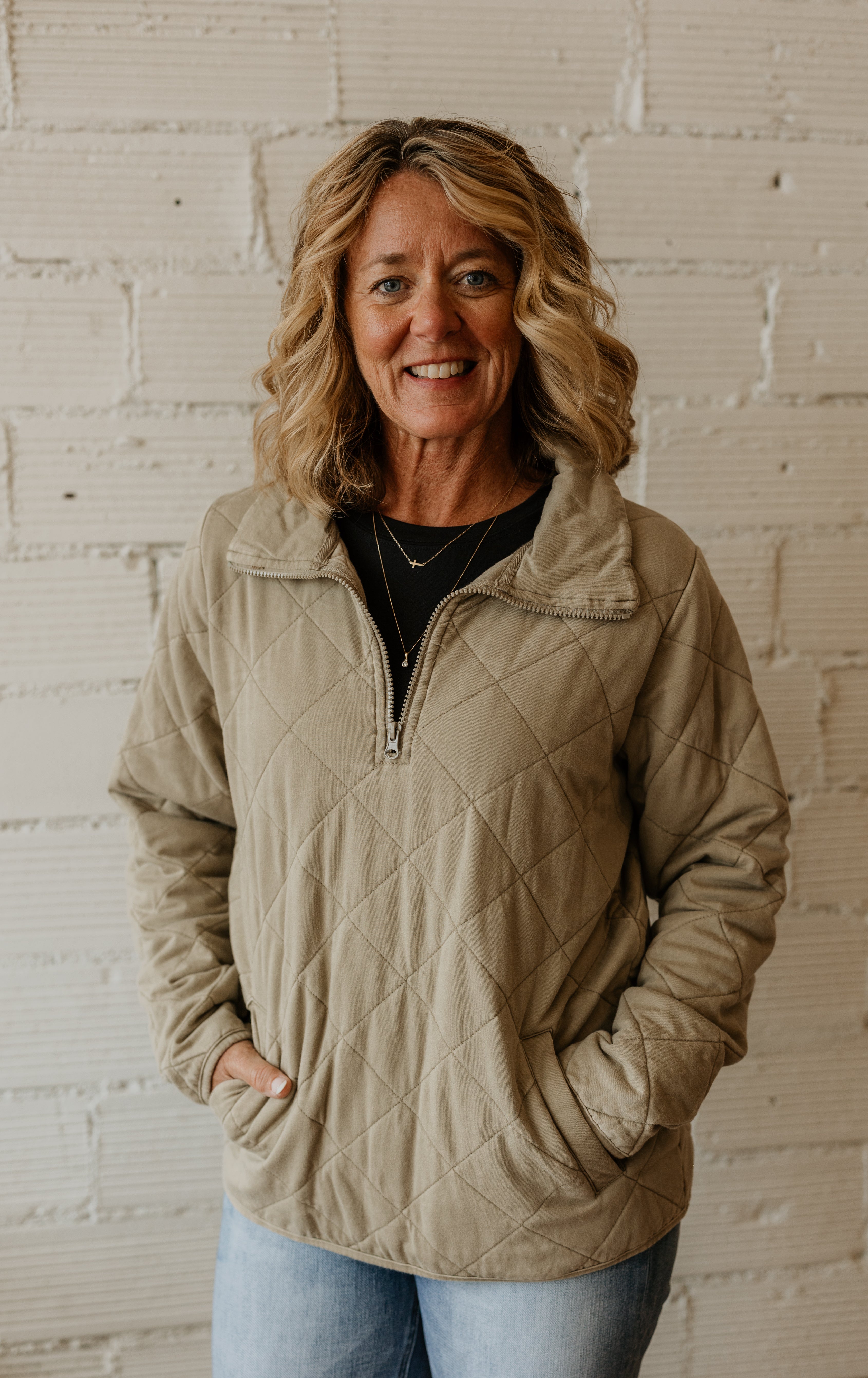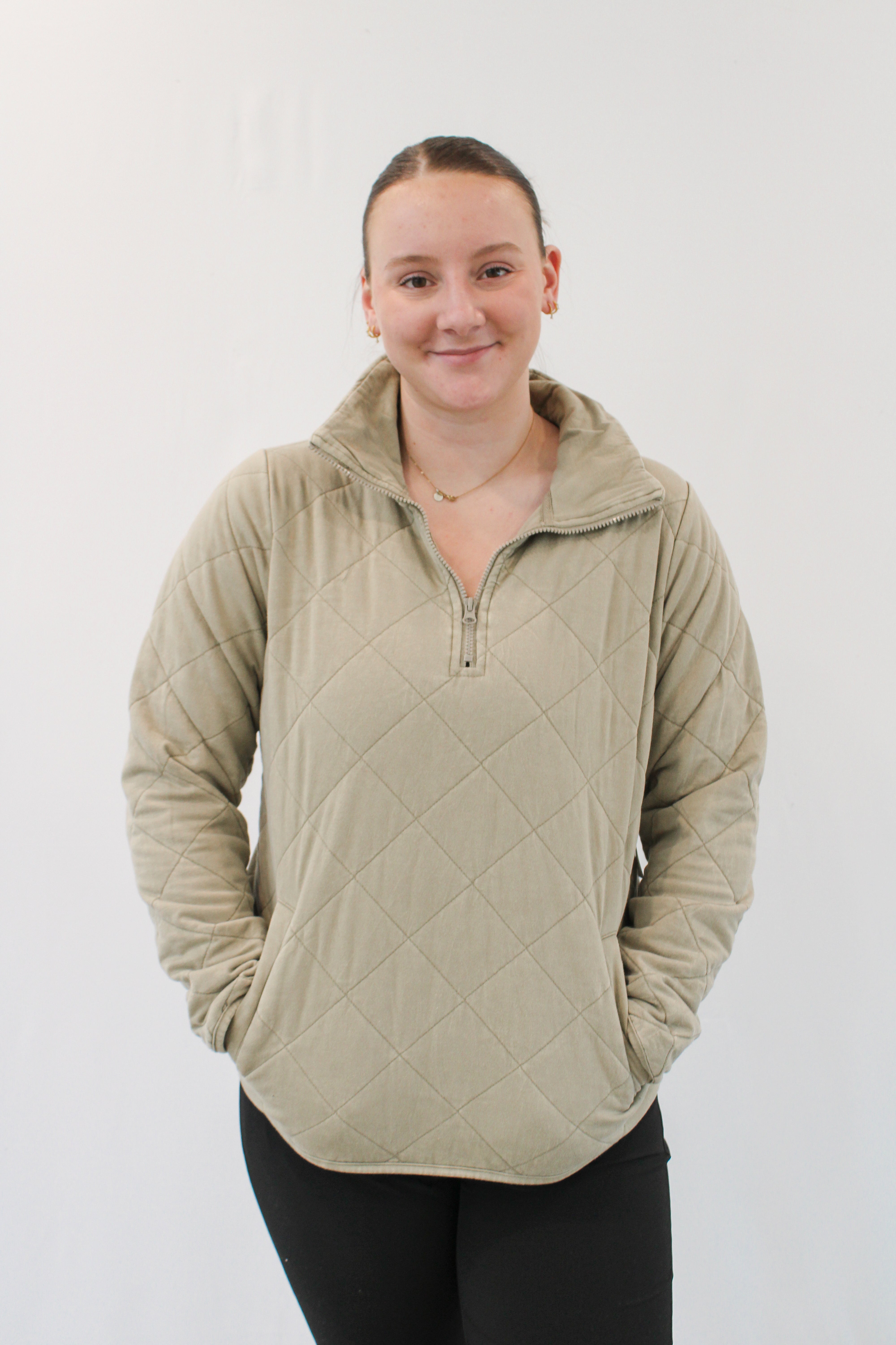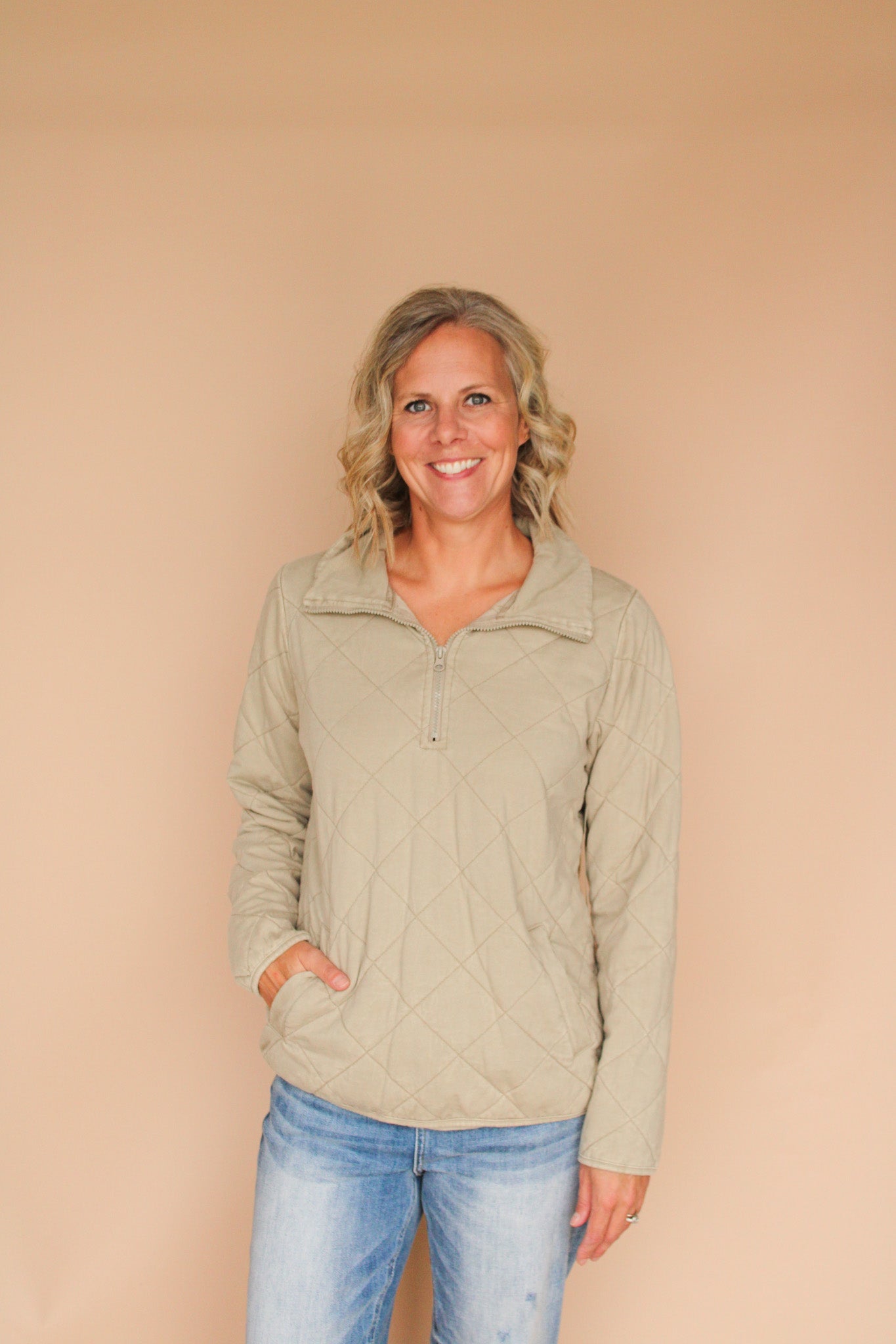Get cozy with the LAIKE MINERAL-WASHED PULLOVER! With a quilted half zip design and a versatile taupe color, this pullover is perfect for any chilly day. Stay stylish and warm all at once.