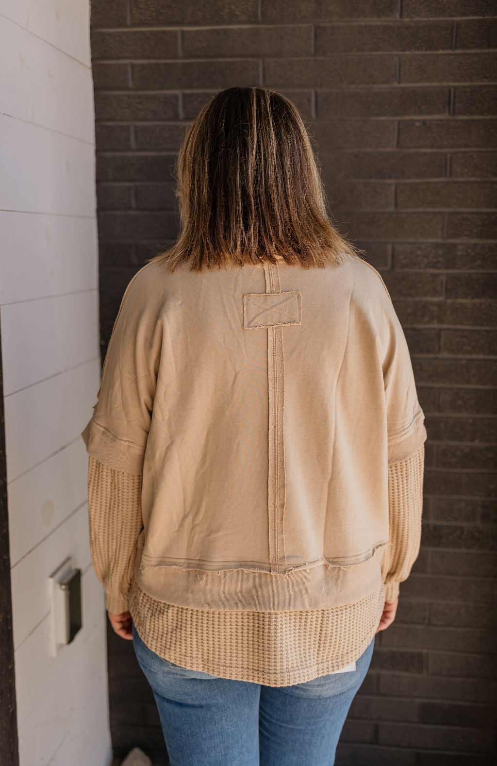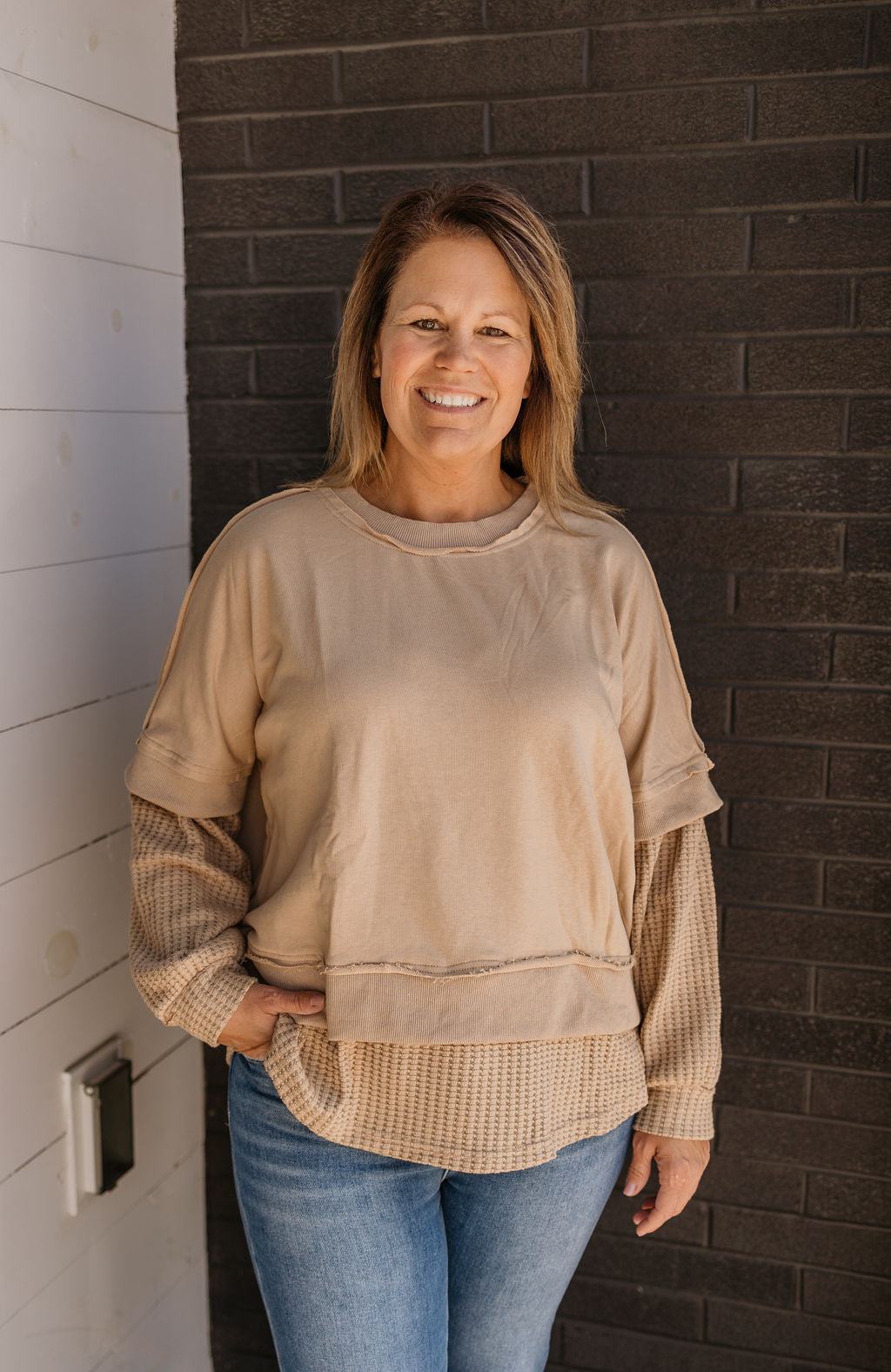 Stay cozy and stylish in the Syd Contrast Sweatshirt Top. This long sleeve sweatshirt boasts a unique mixed media design and a comfy crewneck. Perfect for staying warm in a playful, quirky way!