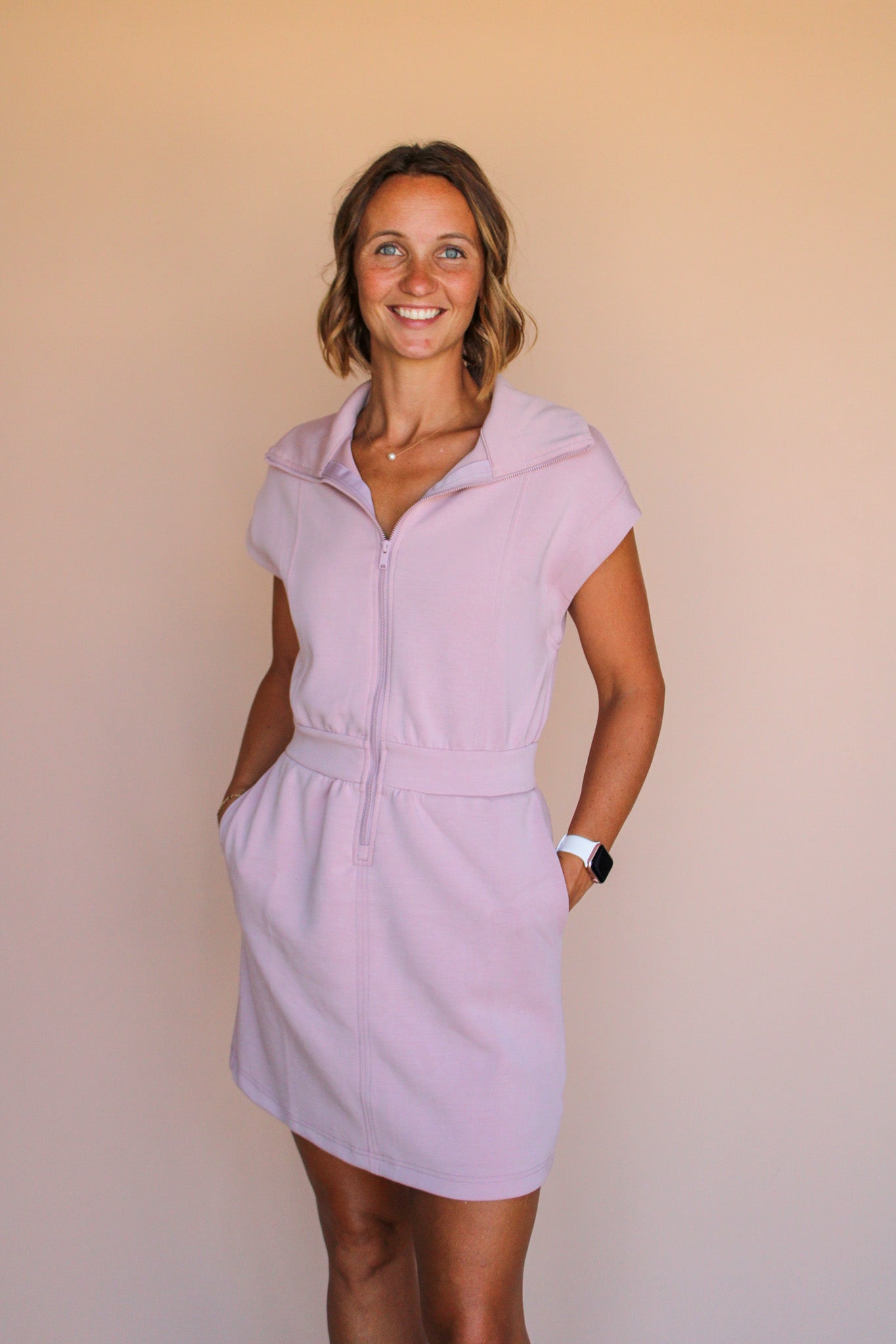 Slip into the ABBIE SPANDEX MINI DRESS and feel the silky smooth, lightweight fabric hug your curves just right. With playful short sleeves, a handy side pocket, and a chic half zip-up front, this dress blends fun and function effortlessly. The seaming details add a flirty touch, making it your go-to for stylish everyday adventures.