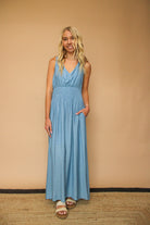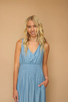 This dusty blue maxi dress features a playful double V-neck and a smocked waist that flatters your figure. The sleeveless design and tie-back detail add a breezy, effortless charm perfect for sunny days or casual outings. Embrace comfort and style with this easygoing, chic dress.