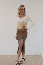 Introducing Cinda - the must-have color block long sleeve sweater dress! With a round neckline and front slit, it's both stylish and versatile. Made from soft fabric, it's perfect for any occasion. Get ready to turn heads and stay comfy!