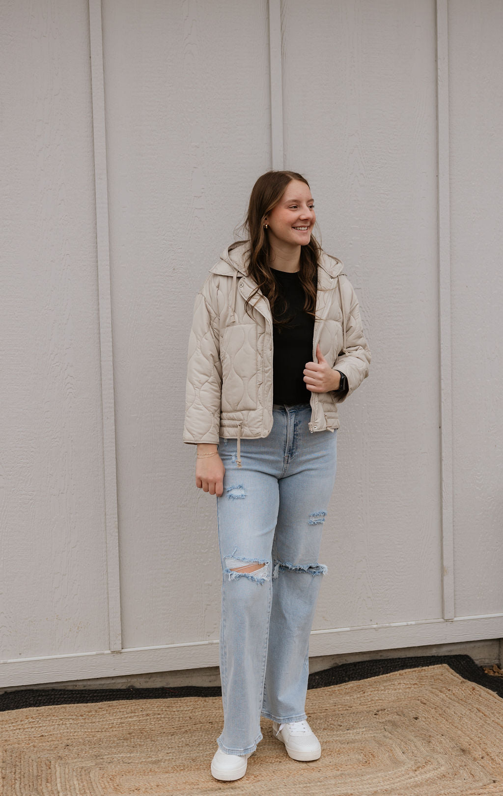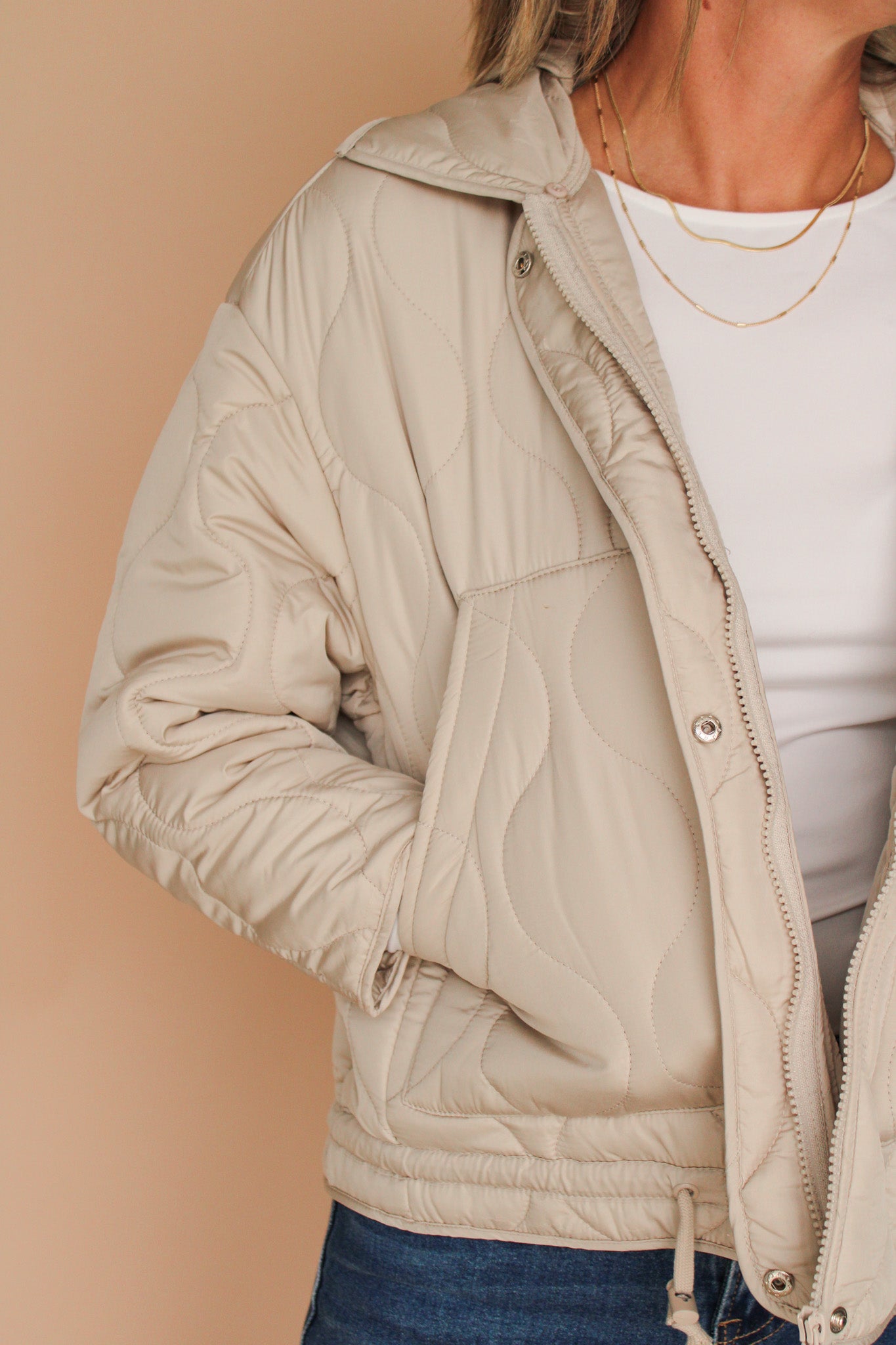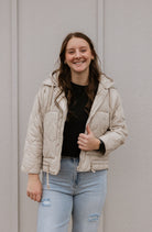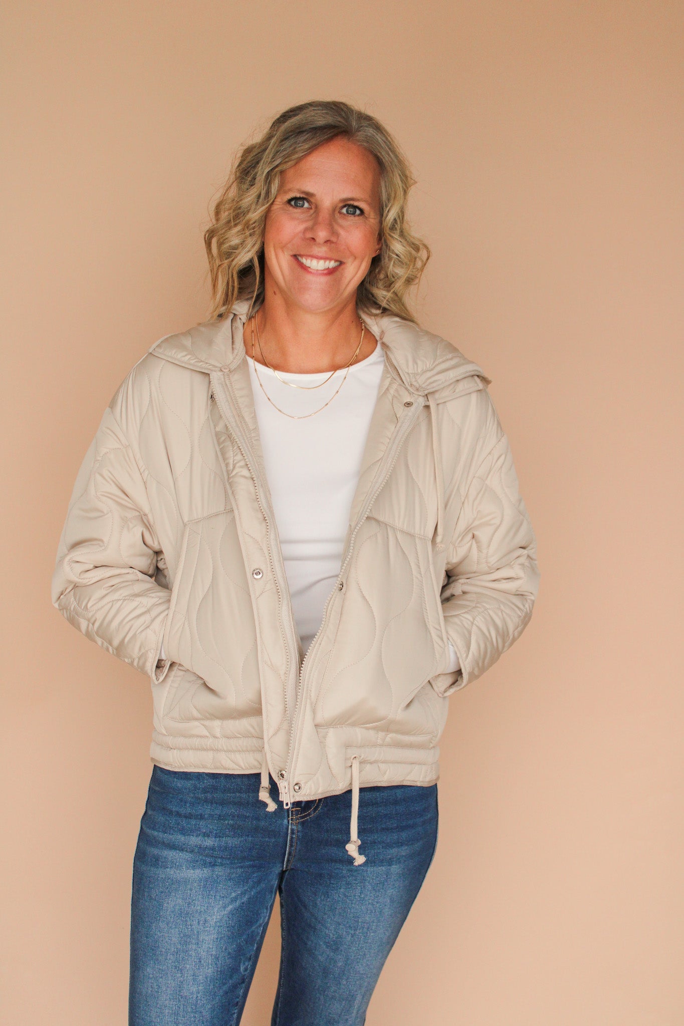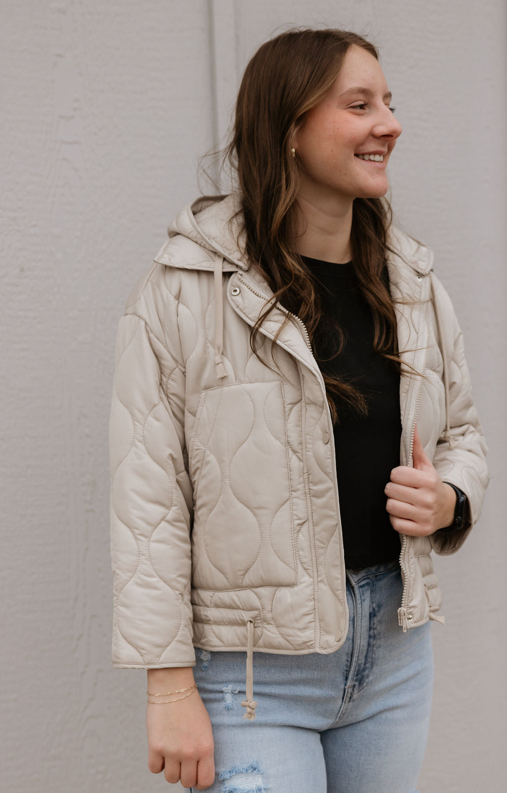 Snuggle into this cream quilted jacket featuring both buttons and a zipper, plus a detachable hoodie—made entirely from cozy polyester!