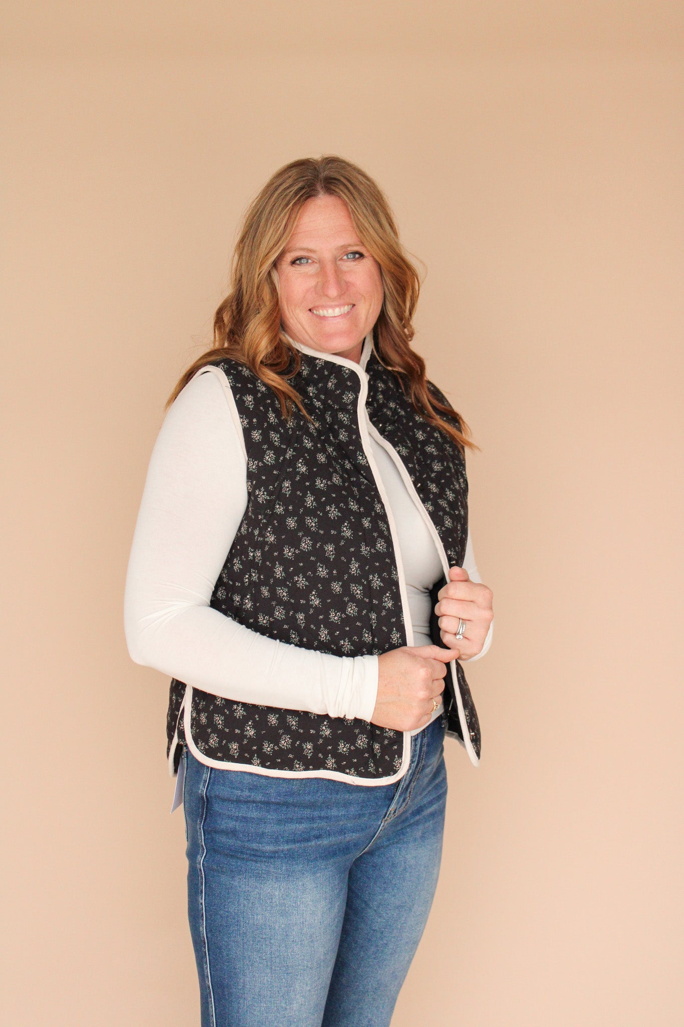 Look cute and stay cozy in our Giana Floral Vest. The playful floral print is complemented by contrast binding and convenient side pockets. Perfect for layering on chilly days.