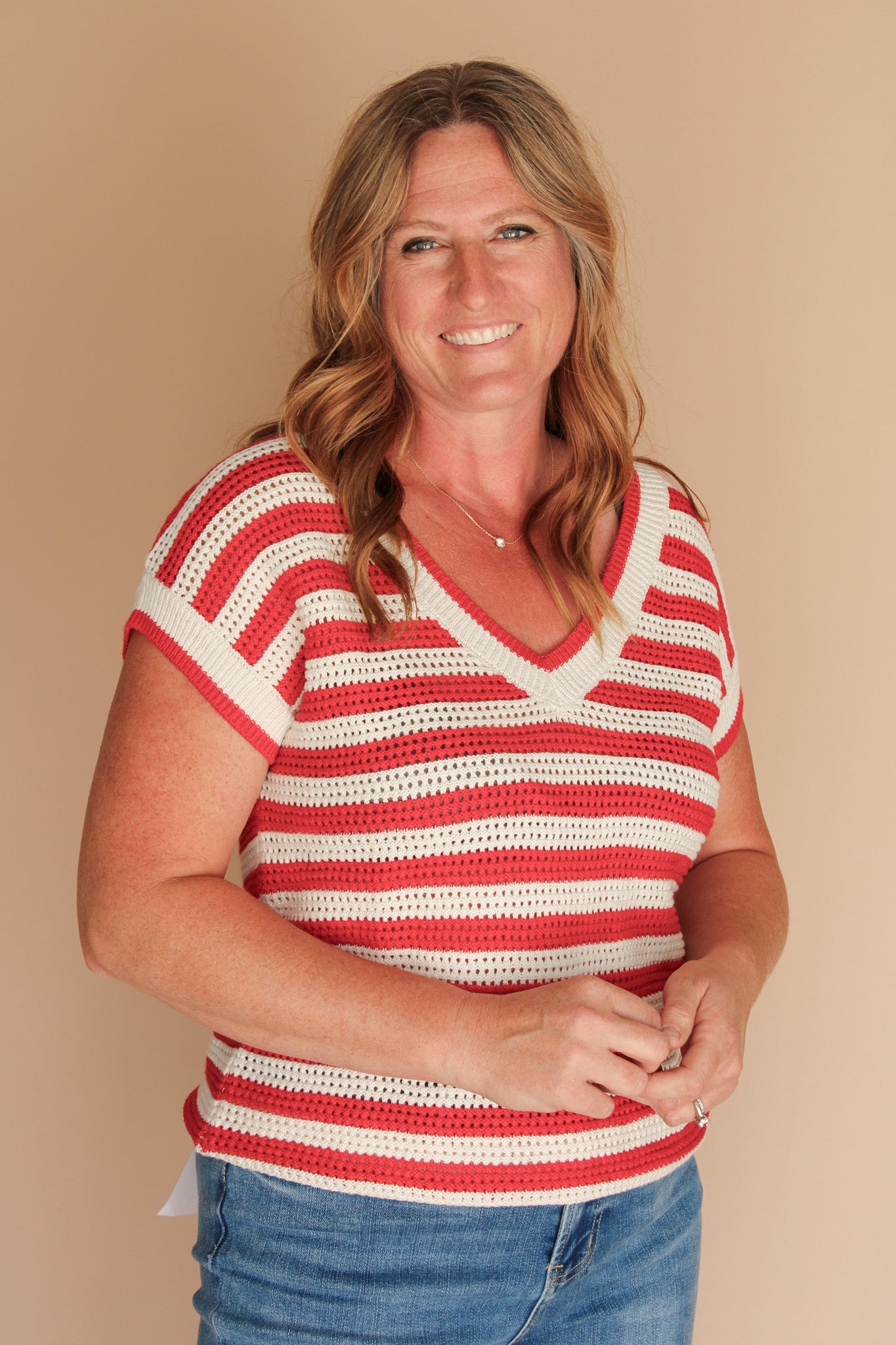 Dive into casual chic with this GLORY STRIPED VNECK SWEATER TOP! The flattering V-neckline adds a touch of feminine flair, while short sleeves keep you cool and comfortable. The trendy drop shoulder design gives this striped sweater a relaxed, effortless vibe that's perfect for mixing and matching with your favorite bottoms. Stripes never looked so fun!