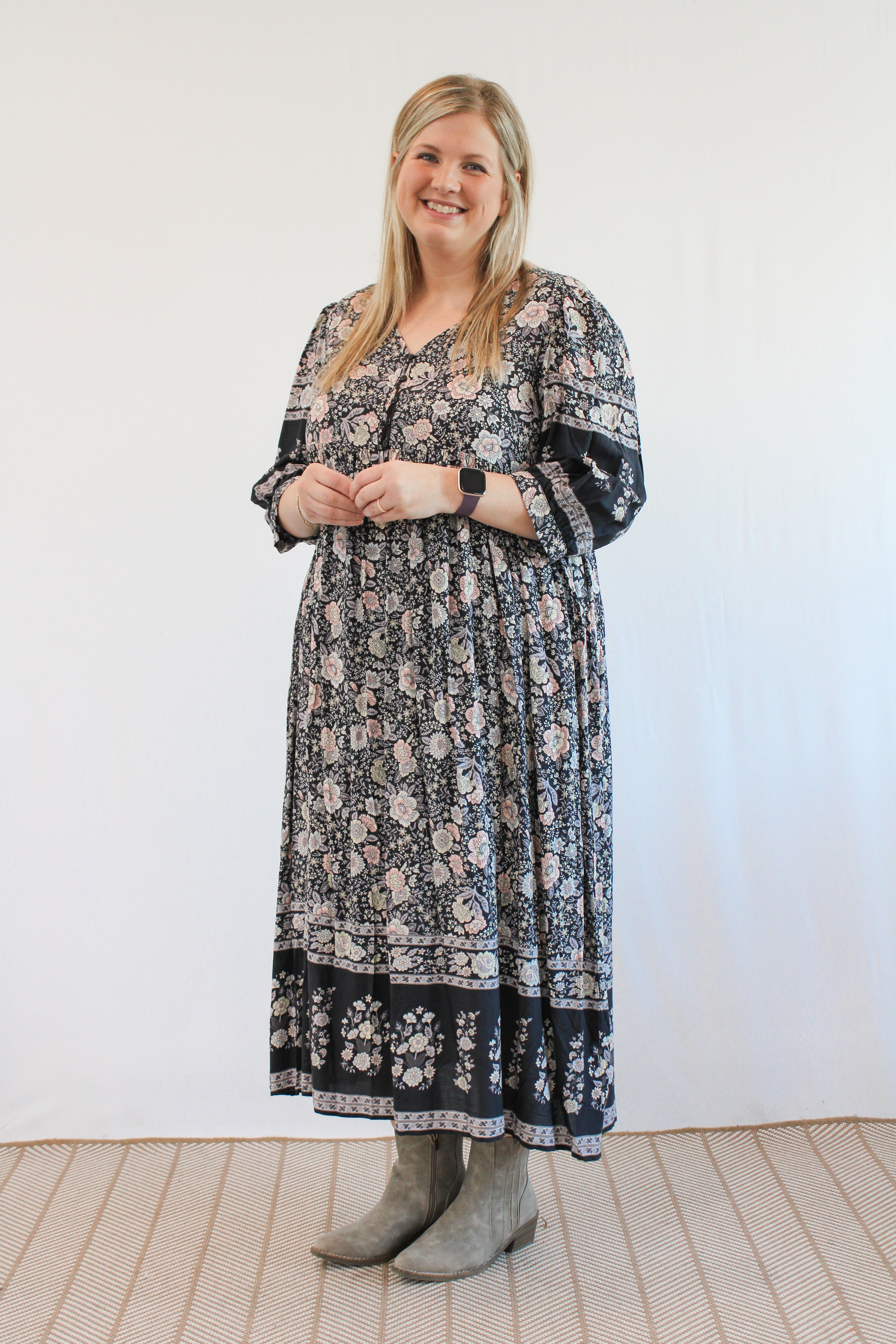 Elevate your style with our Haven Curvy Floral Midi Babydoll Dress. With a playful v-neck, gorgeous floral print, and flirty 3/4 sleeves, this dress combines comfort, cuteness, and chic. Perfect for any occasion, whether you're feeling fancy or just want to feel fabulous.