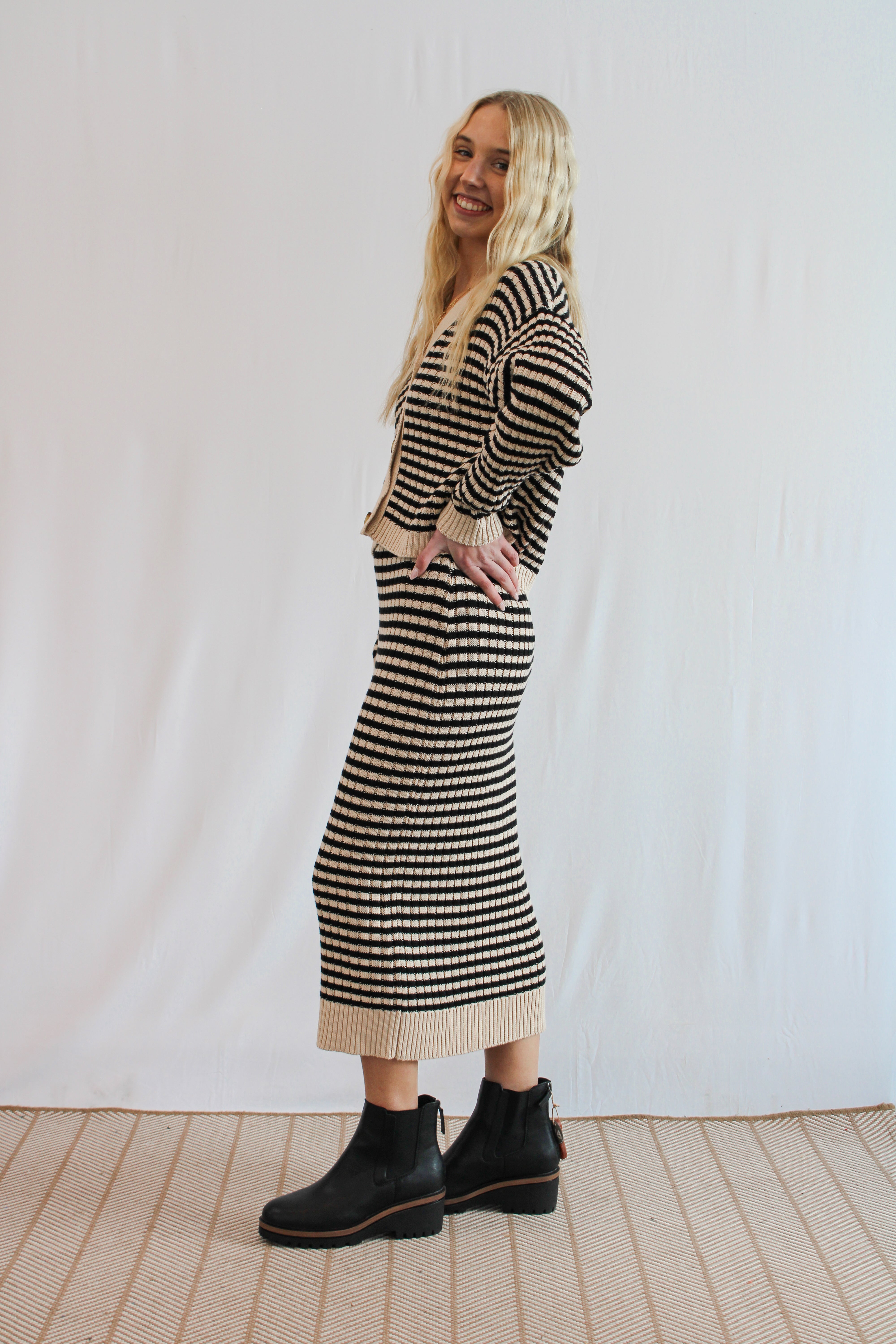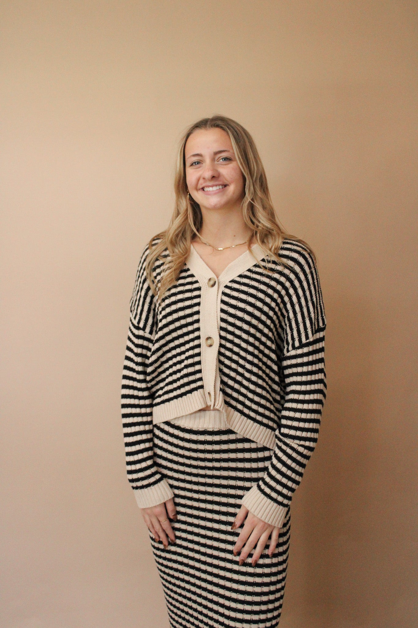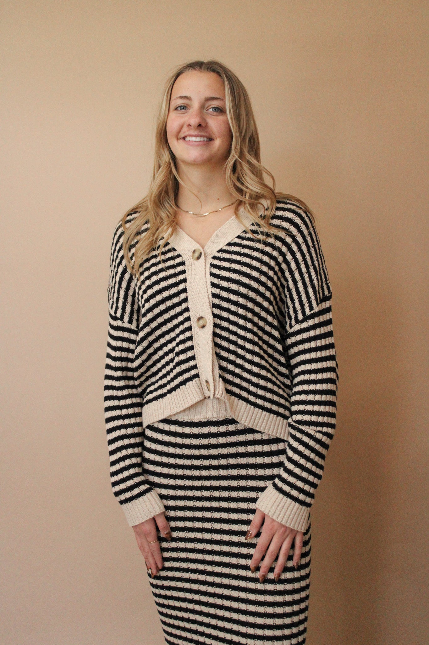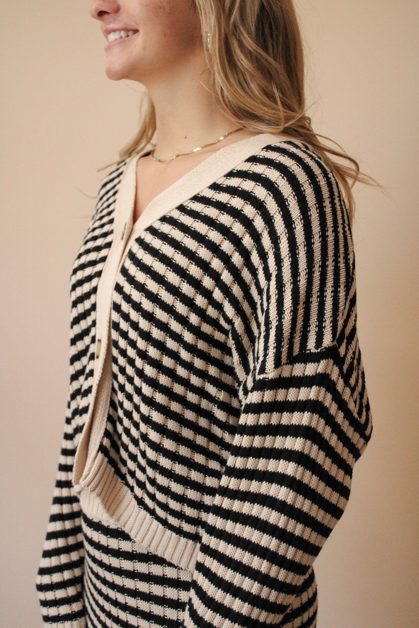 Stay cozy and stylish in the Juniper Striped Knit Cardigan by Ivy & Co. This cream and black striped cardigan features a soft and stretchy knit material, three functional buttons down the front, and ribbing at the sleeve cuffs and hem. With its slightly oversized fit, it's the perfect addition to your wardrobe.