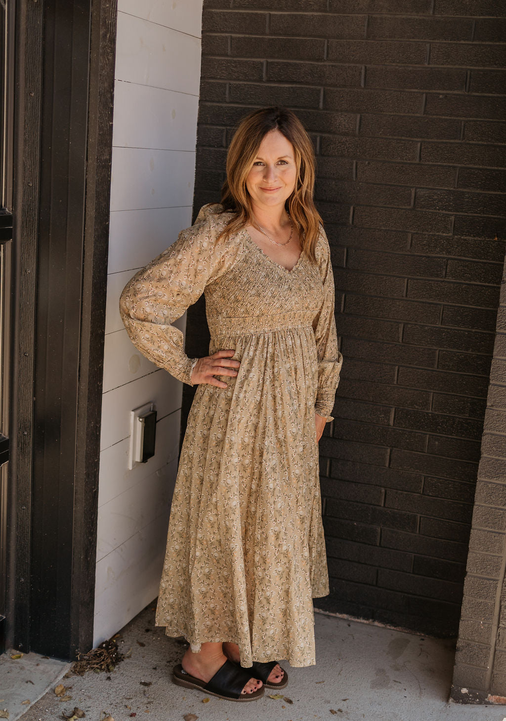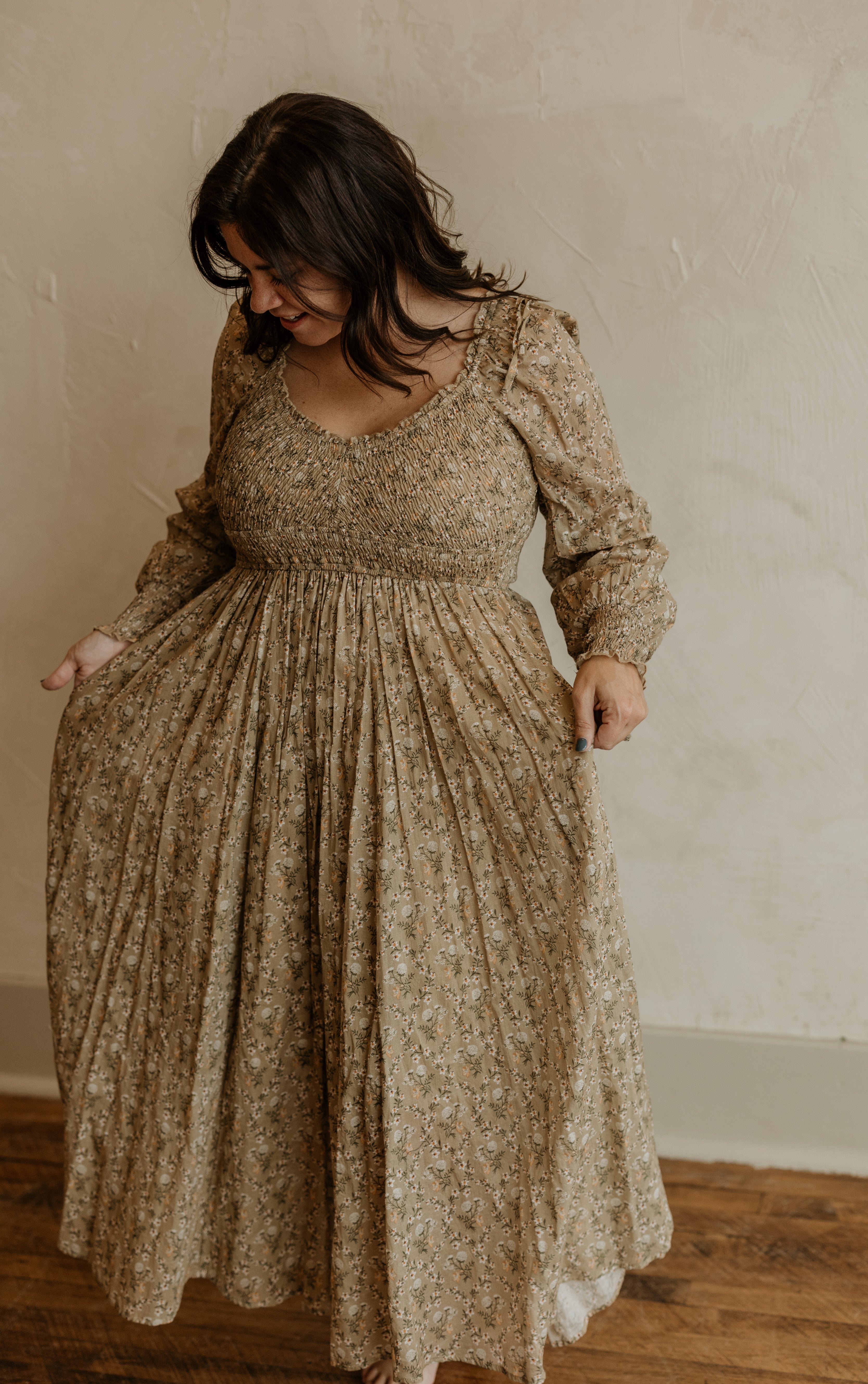Made from a soft and breathable cotton floral fabric, this dress features a smocked bodice and voluminous sleeve ends for a flattering and comfortable fit. Plus, it has handy side pockets for all your essentials. Perfect for any occasion!
