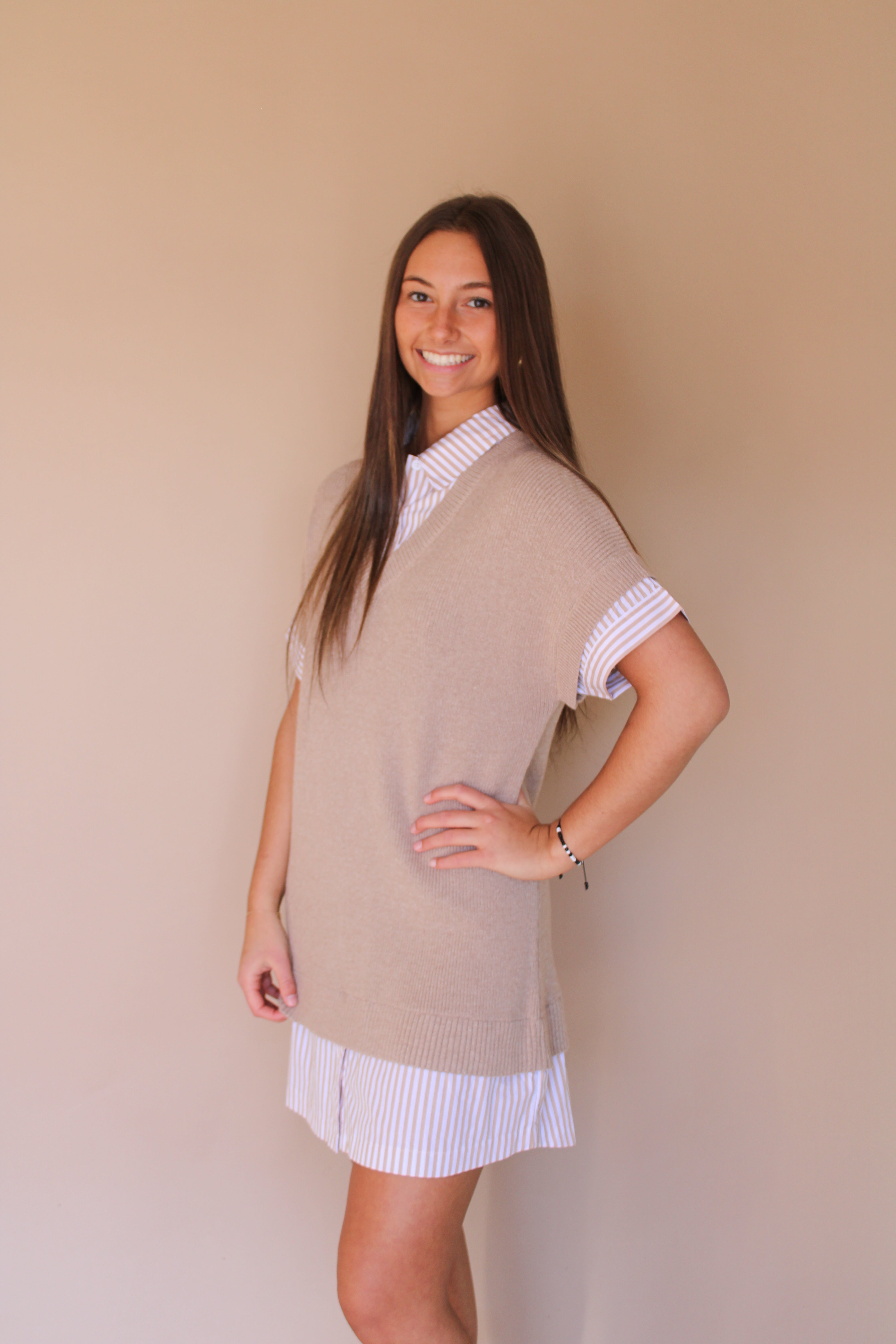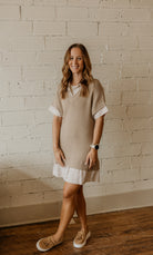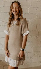 Step into playful style with the Liza Sweater Shirt Mini Dress. This fun twofer design combines cozy sweater comfort with the sharp look of a shirt dress, perfect for mixing and matching your favorite accessories. Whether you’re dressing up or keeping it casual, this mini dress adds a flirty and fresh vibe to your wardrobe. Embrace the Twofer Look for effortless charm and cozy coolness all in one!