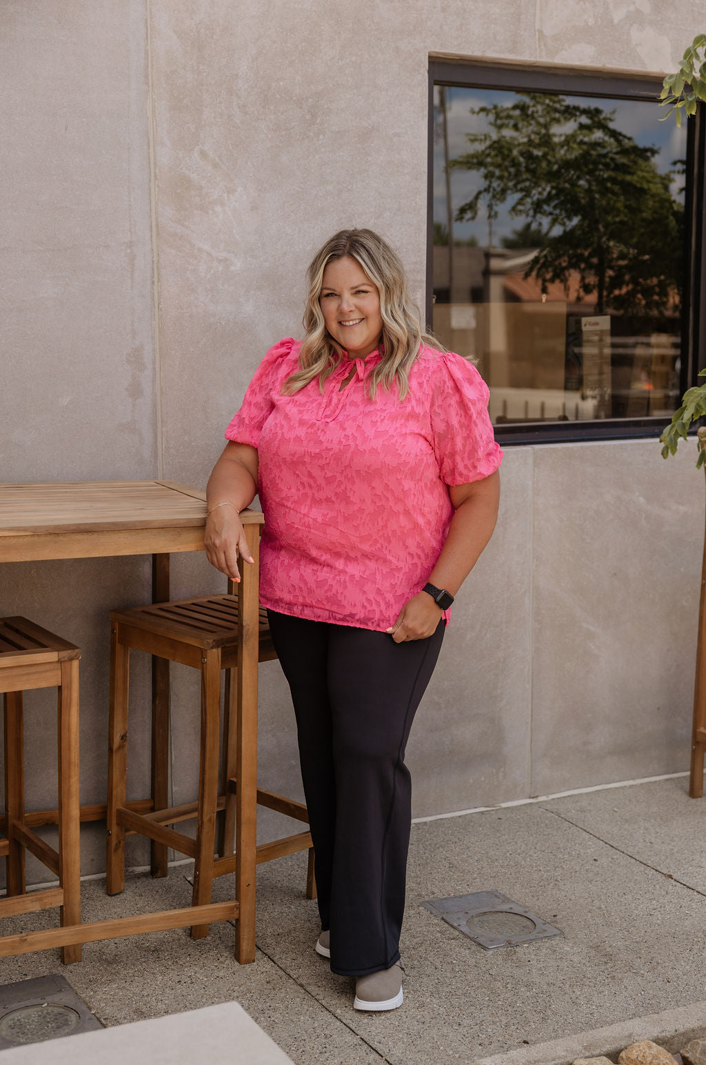 Curvy hot pink textured short sleeve blouse with front tie detailing