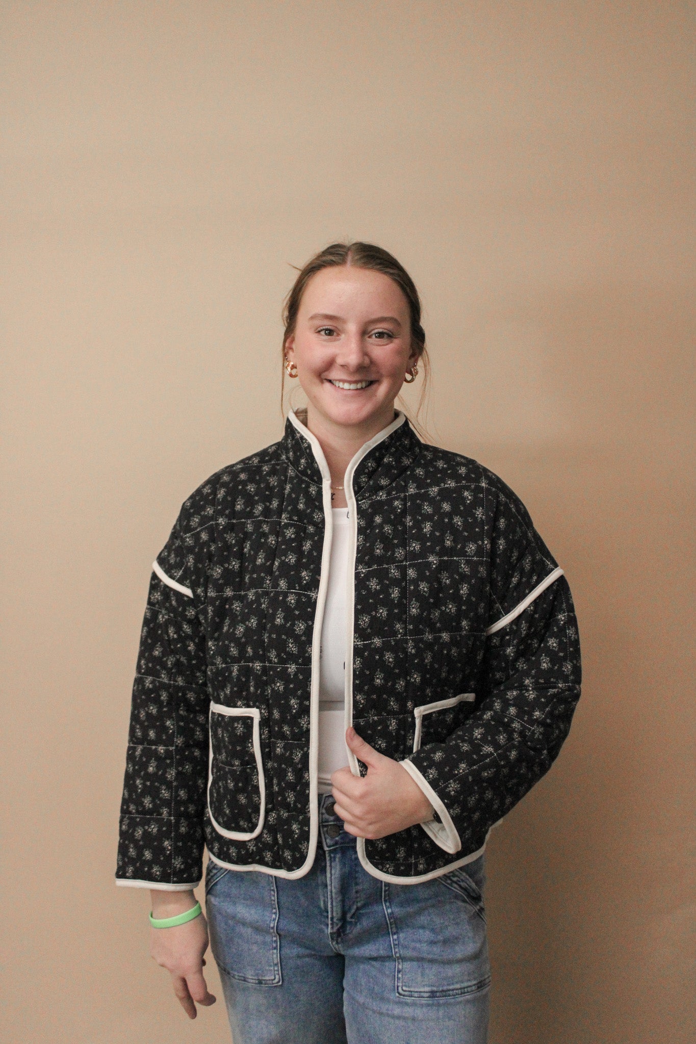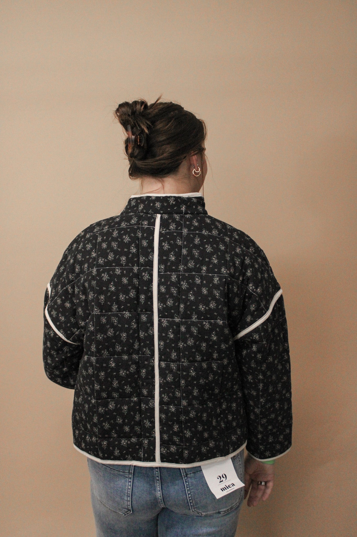 Stay cozy and stylish in our Stand Collar Floral Print Quilted Jacket! This unique jacket features a convenient front pocket, contrast binding, and a playful floral print. Made with a combination of cotton and linen, it's perfect for any season.