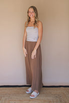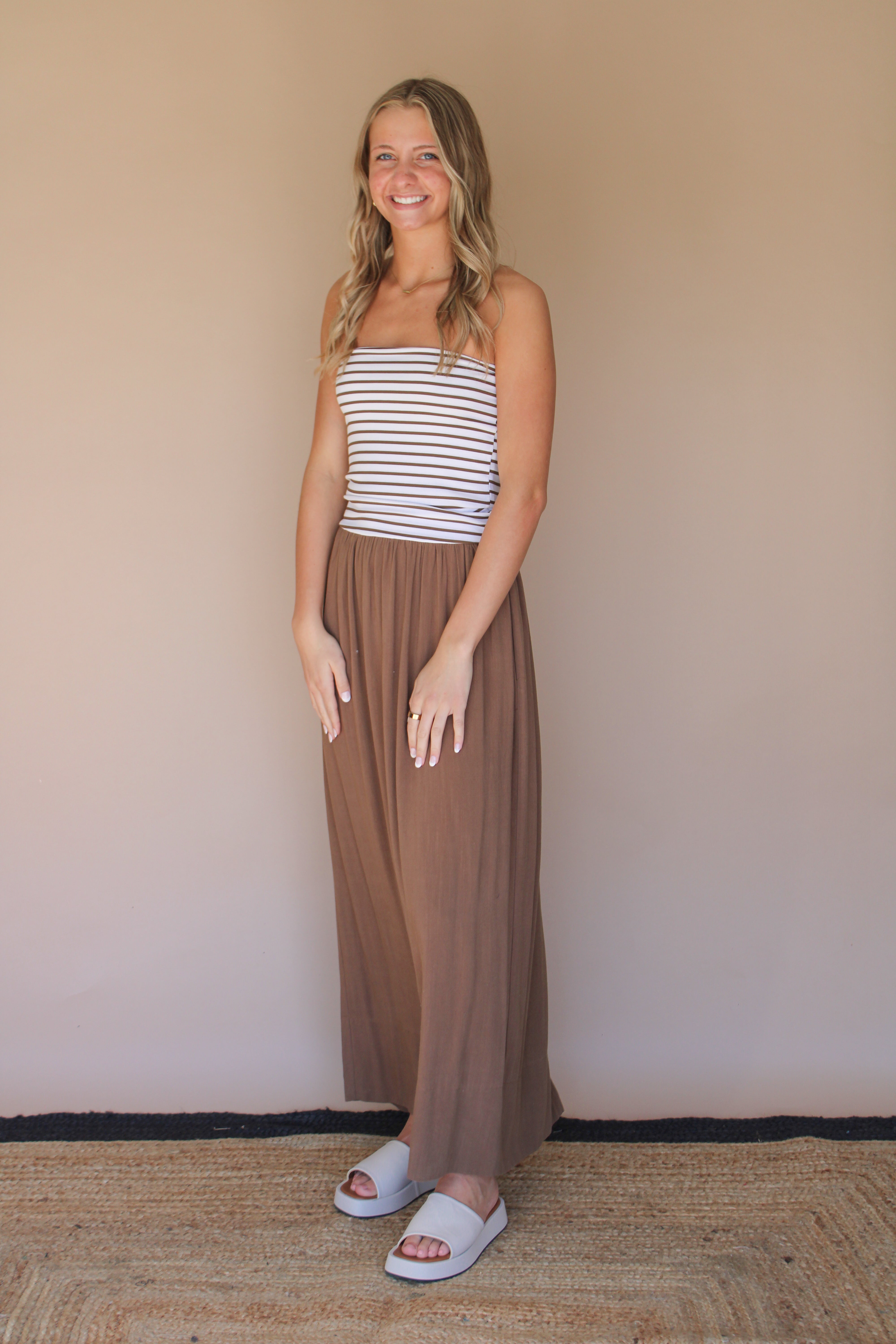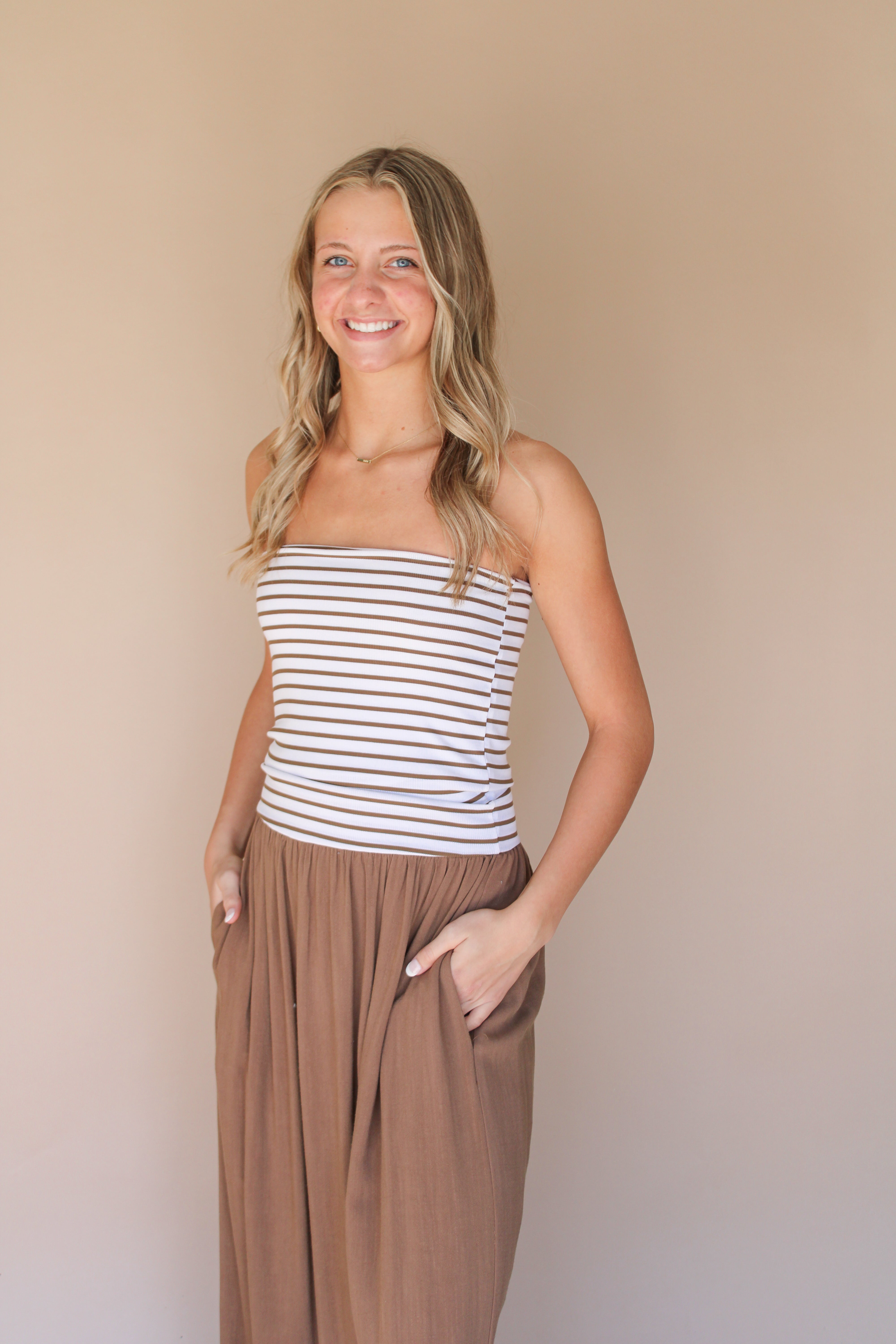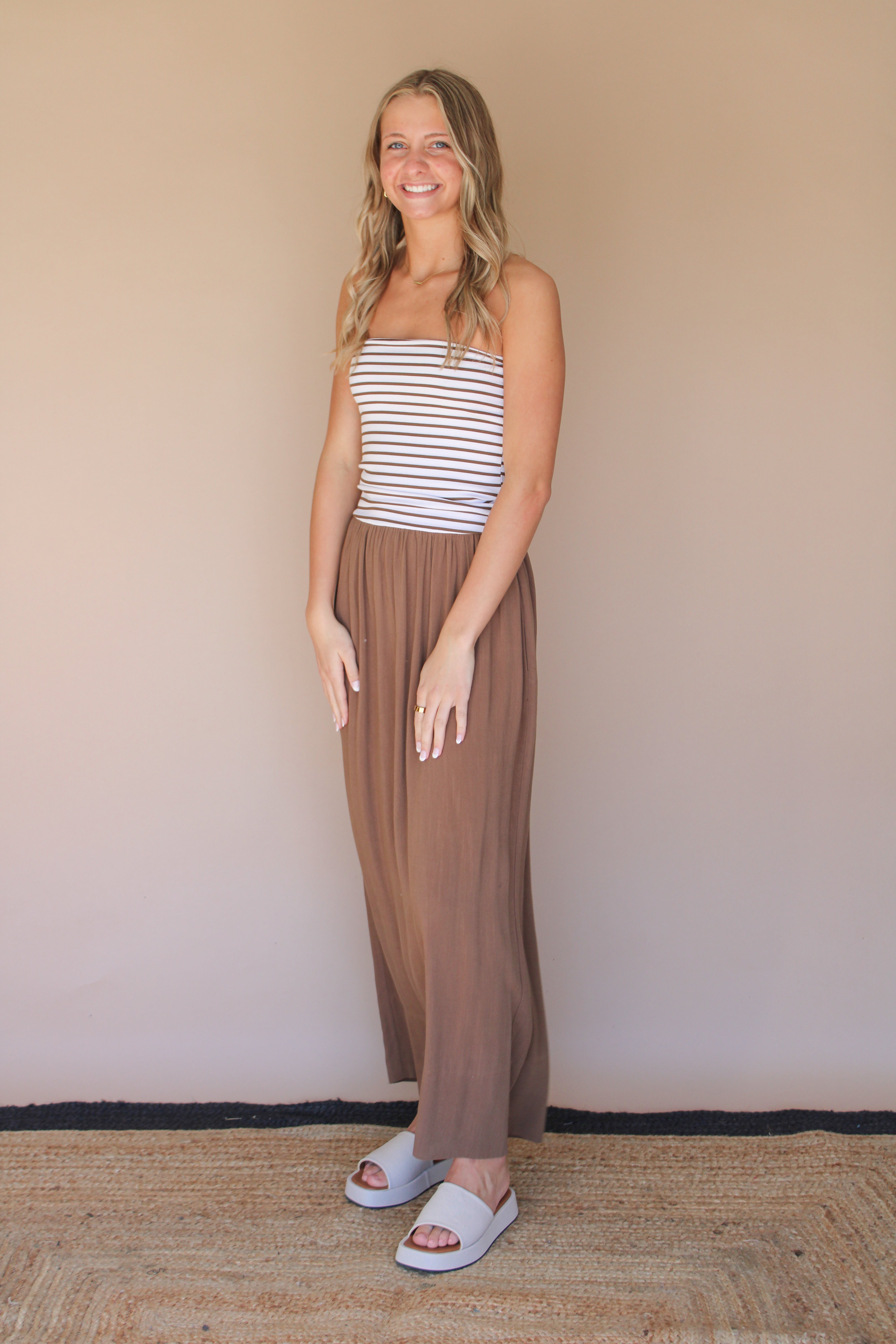This effortlessly chic dress is made for sunny days and barefoot strolls. It features a strapless, fitted bodice with classic white and taupe horizontal stripes, perfectly balanced by a flowy, high-waisted mocha skirt that drapes to the ankles. The lightweight, breathable fabric makes it ideal for warm-weather outings, whether you're headed to brunch or the boardwalk. Finished with neutral slide sandals, this look is the definition of casual elegance with a touch of coastal charm.